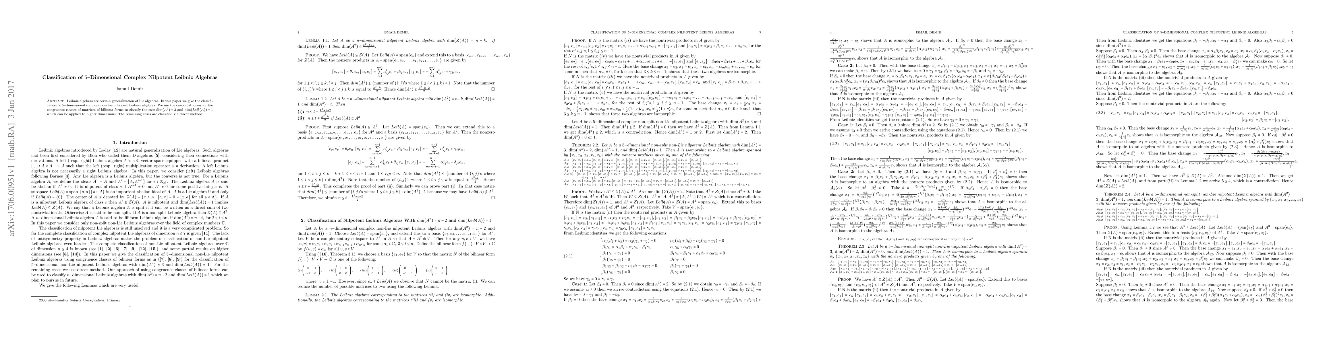 Leibniz algebras are certain generalization of Lie algebras. In this paper we give the classification of $5-$dimensional complex non-Lie nilpotent Leibniz algebras. We use the canonical forms for the congruence classes of matrices of bilinear forms to classify the case $\dim(A^2)=3$ and $\dim(Leib(A))=1$ which can be applied to higher dimensions. The remaining cases are classified via direct method.