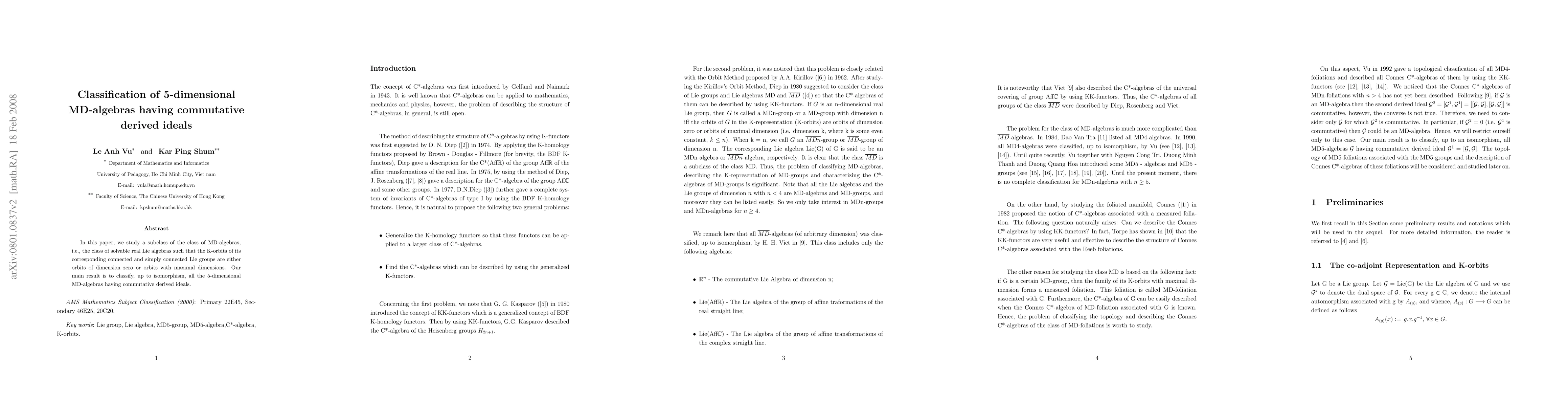 In this paper, we study a subclass of the class of MD-algebras, i.e., the class of solvable real Lie algebras such that the K-orbits of its corresponding connected and simply connected Lie groups are either orbits of dimension zero or orbits with maximal dimensions. Our main result is to classify, up to isomorphism, all the 5-dimensional MD-algebras having commutative derived ideals.