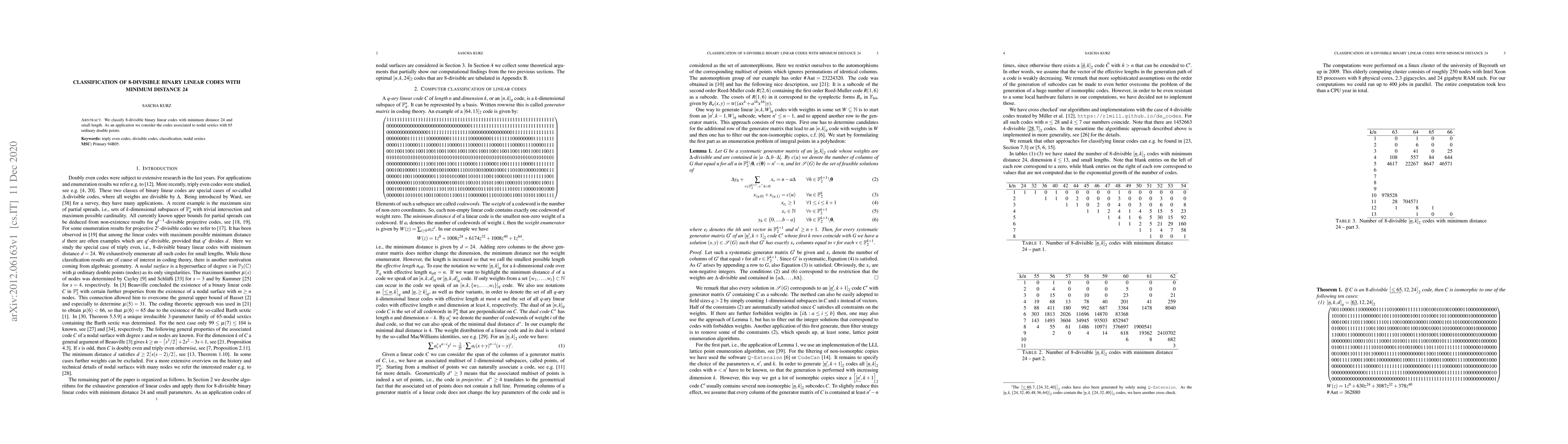 Summary: This paper classifies 8-divisible binary linear codes with minimum distance 24 and small length, providing a detailed analysis of these codes and their application to nodal sextics with 65 ordinary double points.
