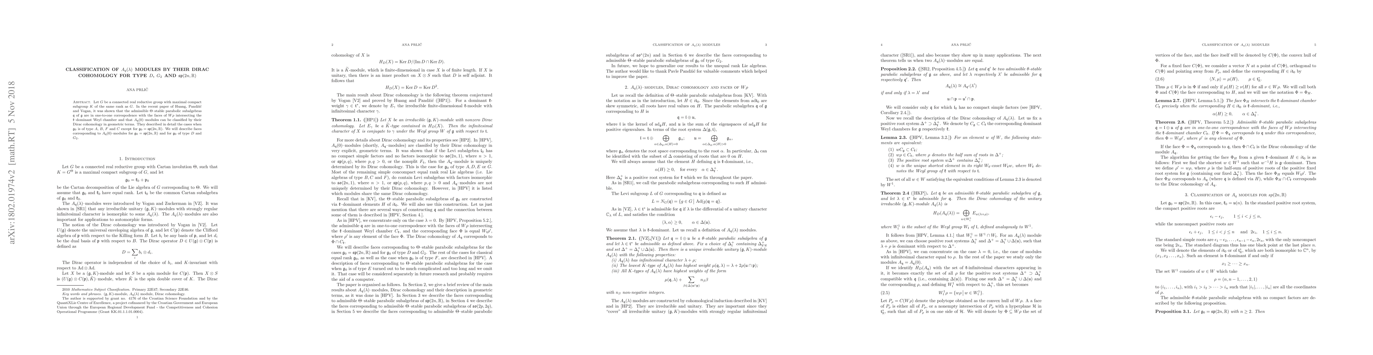 Let $G$ be a connected real reductive group with maximal compact subgroup $K$ of the same rank as $G$. In the recent paper of Huang, Pand\v{z}i\'{c} and Vogan, it was shown that the admissible $\Theta$--stable parabolic subalgebras $\mathfrak{q}$ of $\mathfrak{g}$ are in one-to-one correspodence with the faces of $W \rho$ intersecting the $\mathfrak{k}$--dominant Weyl chamber and that $A_{\mathfrak{q}}(0)$--modules can be classified by their Dirac cohomology in geometric terms. They described in detail the cases when $\mathfrak{g}_0$ is of type $A$, $B$, $F$ and $C$ except for $\mathfrak{g}_0 = \mathfrak{sp}(2n, \mathbb{R})$. We will describe faces corresponding to $A_{\mathfrak{q}}(0)$--modules for $\mathfrak{g}_0 = \mathfrak{sp}(2n, \mathbb{R})$ and for $\mathfrak{g}_0$ of type $D$ and $G_2$.