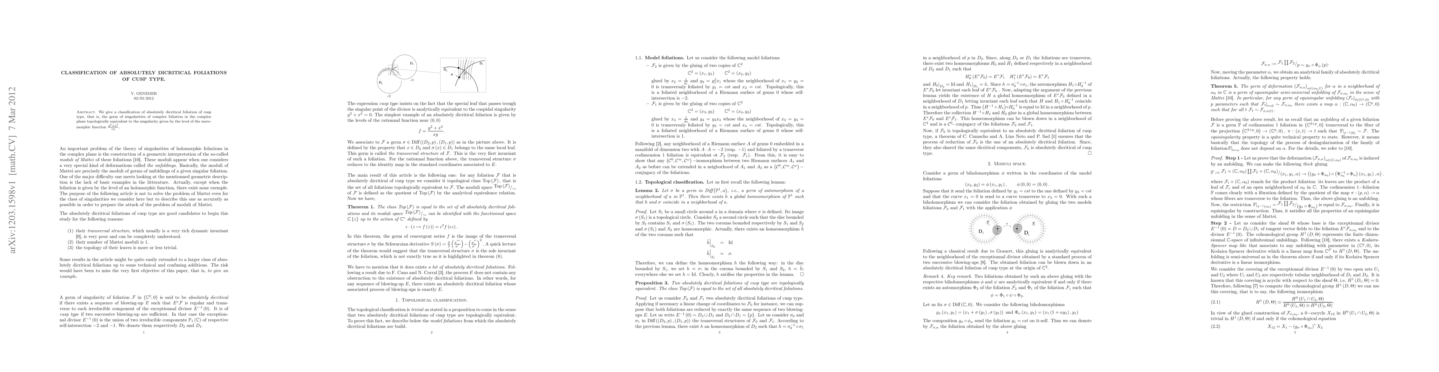 This paper classifies absolutely dicritical foliations of cusp type, focusing on the singularities in the complex plane equivalent to the level set of the meromorphic function \( \frac{y^{2}+x^{3}}{xy} \). The study provides a systematic framework for understanding these complex foliations.