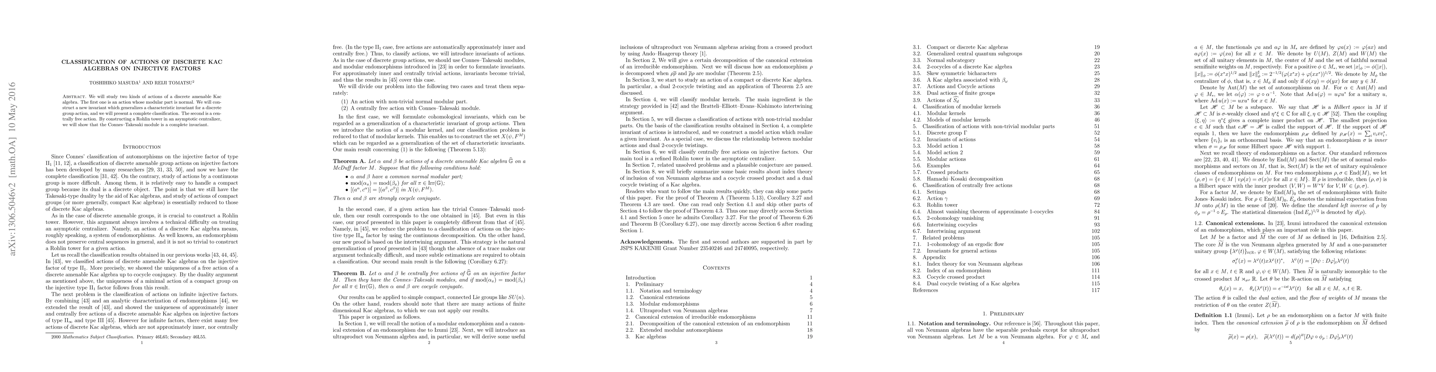 This paper classifies two types of actions of discrete amenable Kac algebras on injective factors: one with a normal modular part and another centrally free. It introduces a new invariant for the former and uses a Rohlin tower construction for the latter to establish a complete classification.