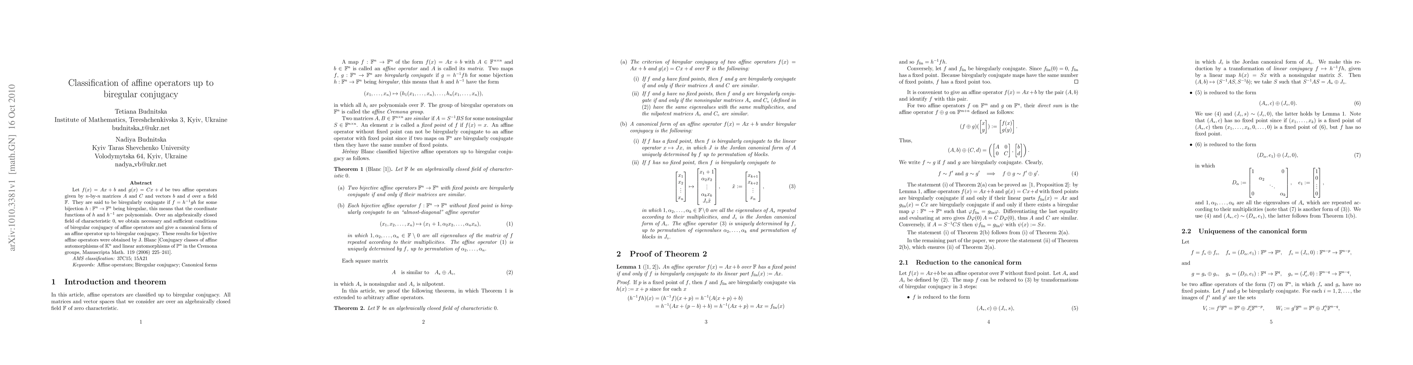 This paper classifies affine operators up to biregular conjugacy by establishing necessary and sufficient conditions over an algebraically closed field of characteristic 0. It also provides a canonical form for affine operators, extending previous results by J. Blanc.