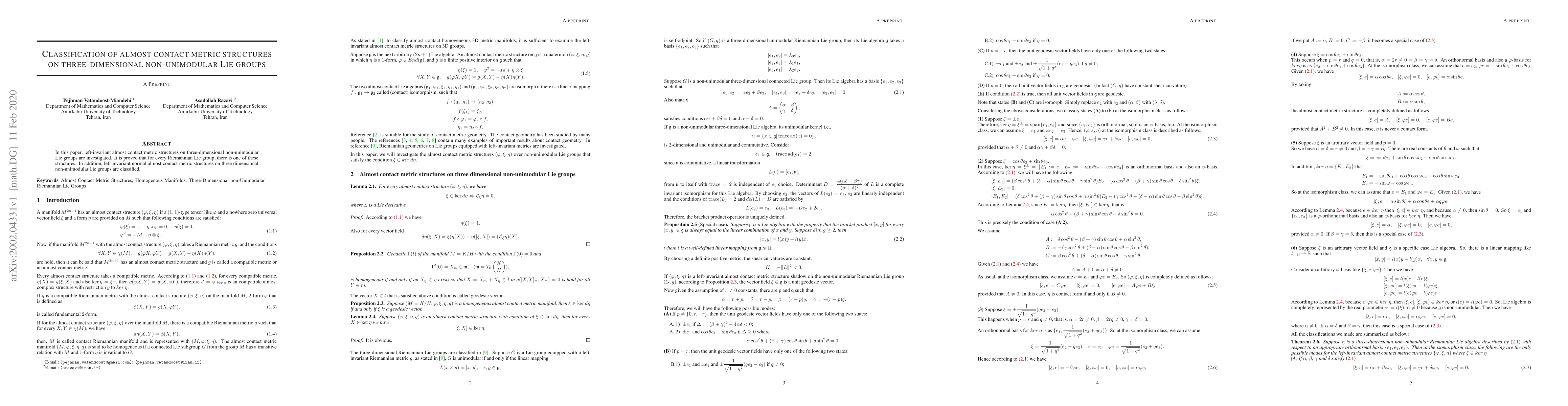 This paper investigates left-invariant almost contact metric structures on three-dimensional non-unimodular Lie groups, proving the existence of such structures for every Riemannian Lie group. It also classifies left-invariant normal almost contact metric structures on these groups.