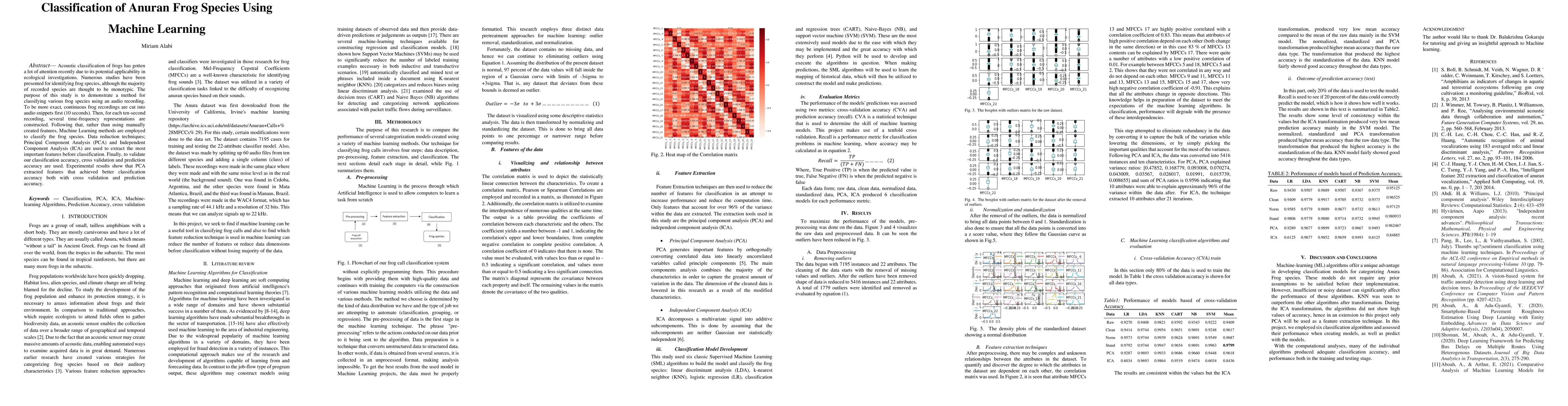 This study employs machine learning techniques to classify anuran frog species based on audio recordings, using time-frequency representations and feature extraction via PCA and ICA. Experimental results indicate that PCA-extracted features yield higher classification accuracy.