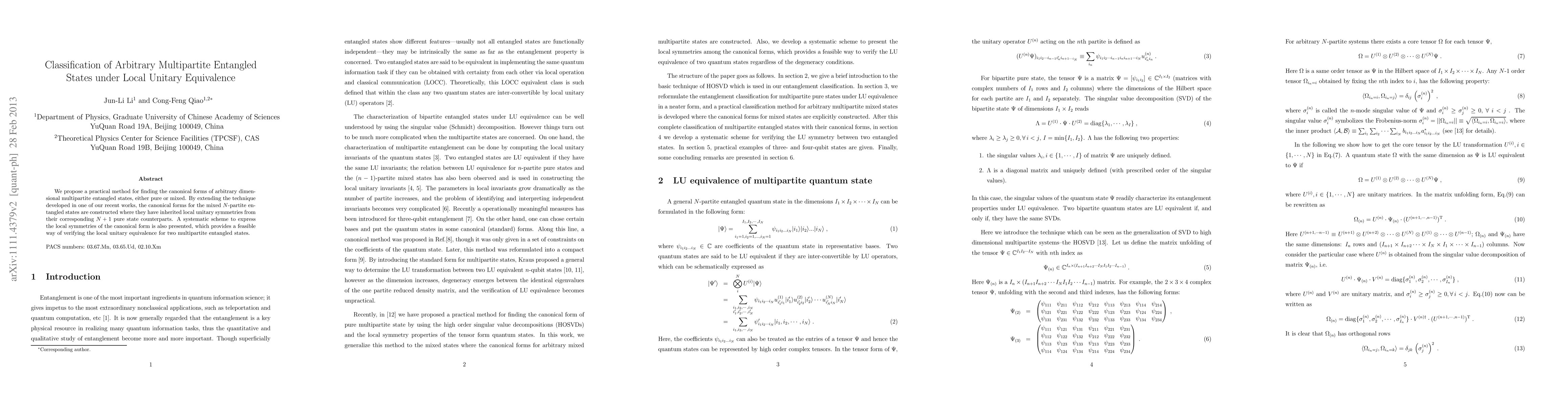 This paper proposes a method to classify arbitrary multipartite entangled states into canonical forms under local unitary equivalence, extending previous techniques to mixed states and providing a systematic scheme for verifying local symmetries.