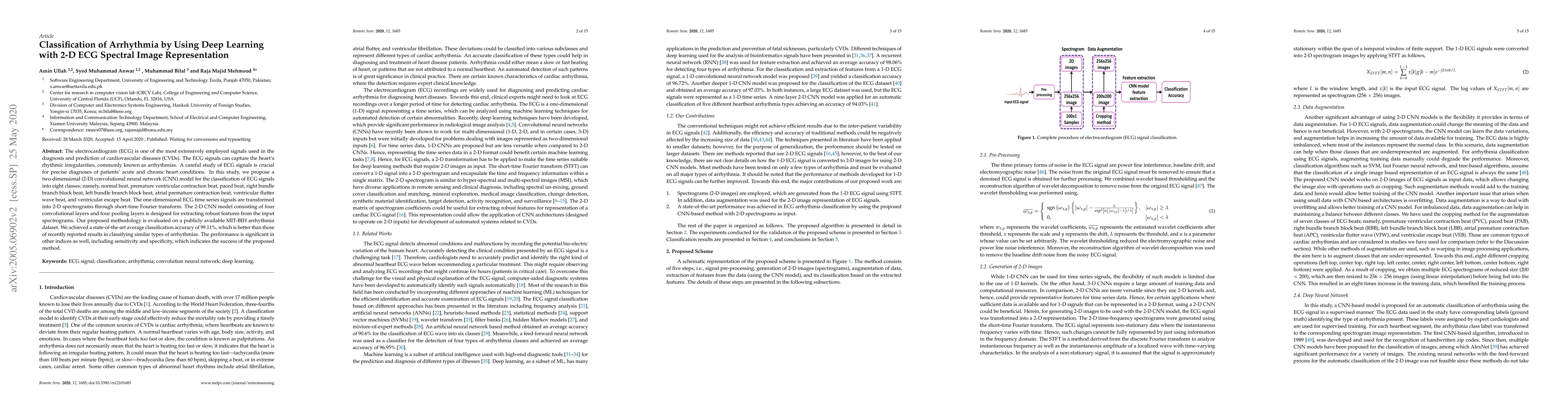 This study proposes a 2-D convolutional neural network (CNN) model for classifying eight types of arrhythmias from ECG signals, transforming 1-D time series into 2-D spectrograms. The model achieves a state-of-the-art average classification accuracy of 99.11% on the MIT-BIH arrhythmia dataset, demonstrating superior performance in sensitivity and specificity.