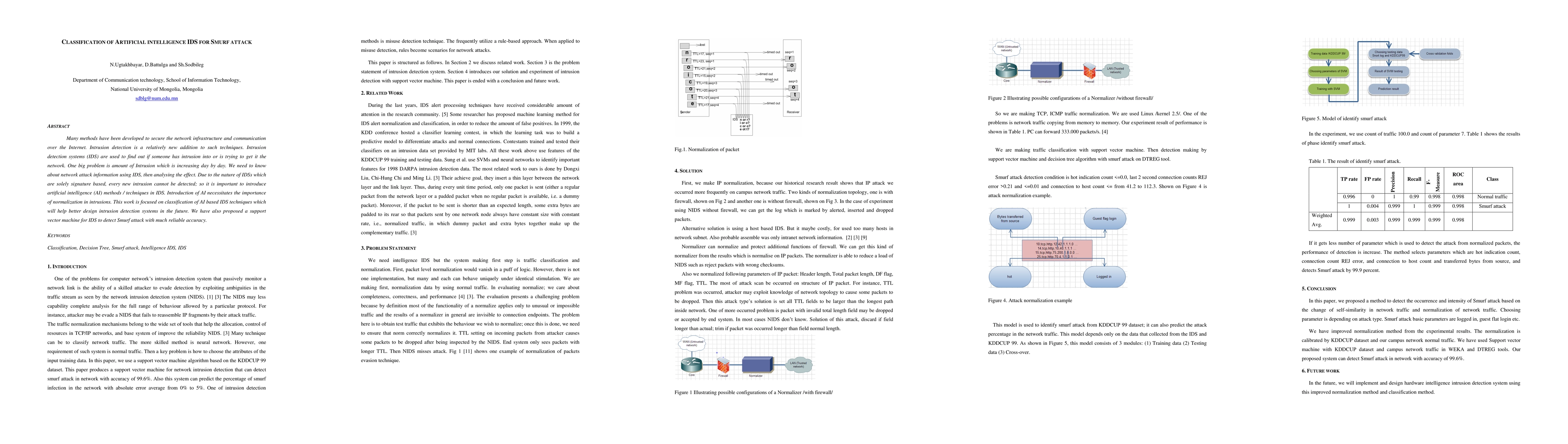 This paper classifies artificial intelligence techniques for intrusion detection systems (IDS) to better secure network infrastructure against increasing intrusions. It proposes a support vector machine for detecting Smurf attacks with high accuracy, emphasizing the need for AI-based methods in IDS due to limitations of traditional signature-based systems.