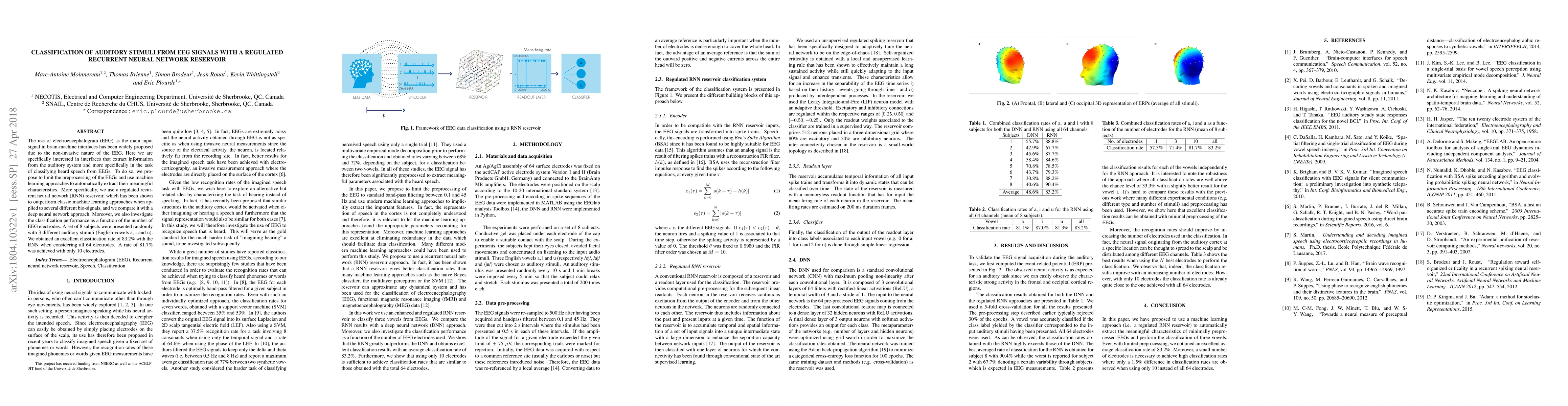 The use of electroencephalogram (EEG) as the main input signal in brain-machine interfaces has been widely proposed due to the non-invasive nature of the EEG. Here we are specifically interested in interfaces that extract information from the auditory system and more specifically in the task of classifying heard speech from EEGs. To do so, we propose to limit the preprocessing of the EEGs and use machine learning approaches to automatically extract their meaningful characteristics. More specifically, we use a regulated recurrent neural network (RNN) reservoir, which has been shown to outperform classic machine learning approaches when applied to several different bio-signals, and we compare it with a deep neural network approach. Moreover, we also investigate the classification performance as a function of the number of EEG electrodes. A set of 8 subjects were presented randomly with 3 different auditory stimuli (English vowels a, i and u). We obtained an excellent classification rate of 83.2% with the RNN when considering all 64 electrodes. A rate of 81.7% was achieved with only 10 electrodes.