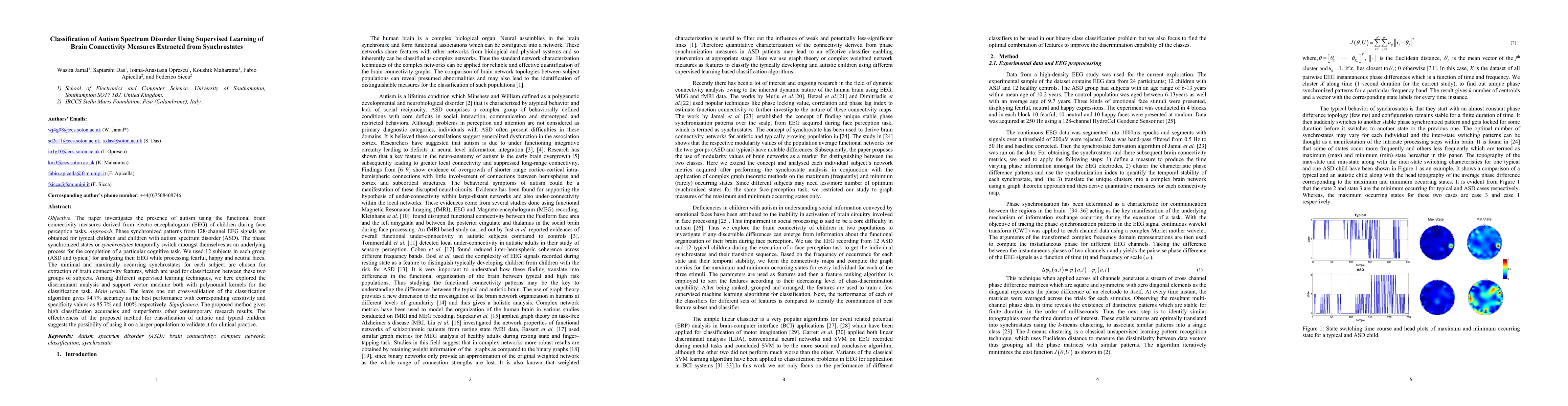 This research develops a supervised learning approach to classify Autism Spectrum Disorder (ASD) using brain connectivity measures extracted from EEG synchrostates during face perception tasks. The method achieves 94.7% accuracy with 85.7% sensitivity and 100% specificity, outperforming other studies and showing potential for clinical validation.