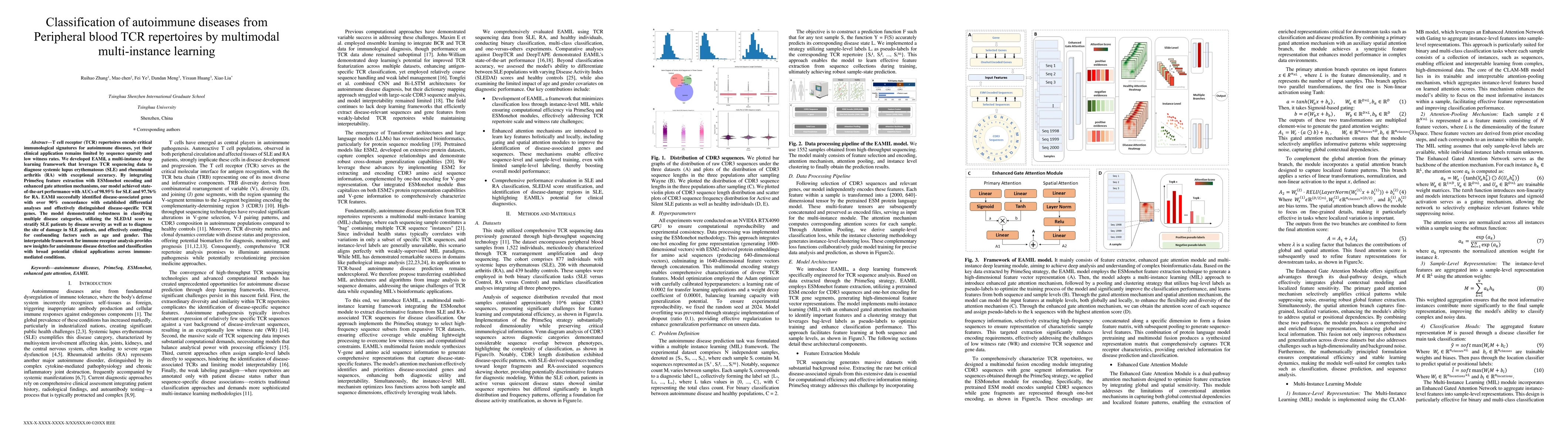 T cell receptor (TCR) repertoires encode critical immunological signatures for autoimmune diseases, yet their clinical application remains limited by sequence sparsity and low witness rates. We developed EAMil, a multi-instance deep learning framework that leverages TCR sequencing data to diagnose systemic lupus erythematosus (SLE) and rheumatoid arthritis (RA) with exceptional accuracy. By integrating PrimeSeq feature extraction with ESMonehot encoding and enhanced gate attention mechanisms, our model achieved state-of-the-art performance with AUCs of 98.95% for SLE and 97.76% for RA. EAMil successfully identified disease-associated genes with over 90% concordance with established differential analyses and effectively distinguished disease-specific TCR genes. The model demonstrated robustness in classifying multiple disease categories, utilizing the SLEDAI score to stratify SLE patients by disease severity as well as to diagnose the site of damage in SLE patients, and effectively controlling for confounding factors such as age and gender. This interpretable framework for immune receptor analysis provides new insights for autoimmune disease detection and classification with broad potential clinical applications across immune-mediated conditions.