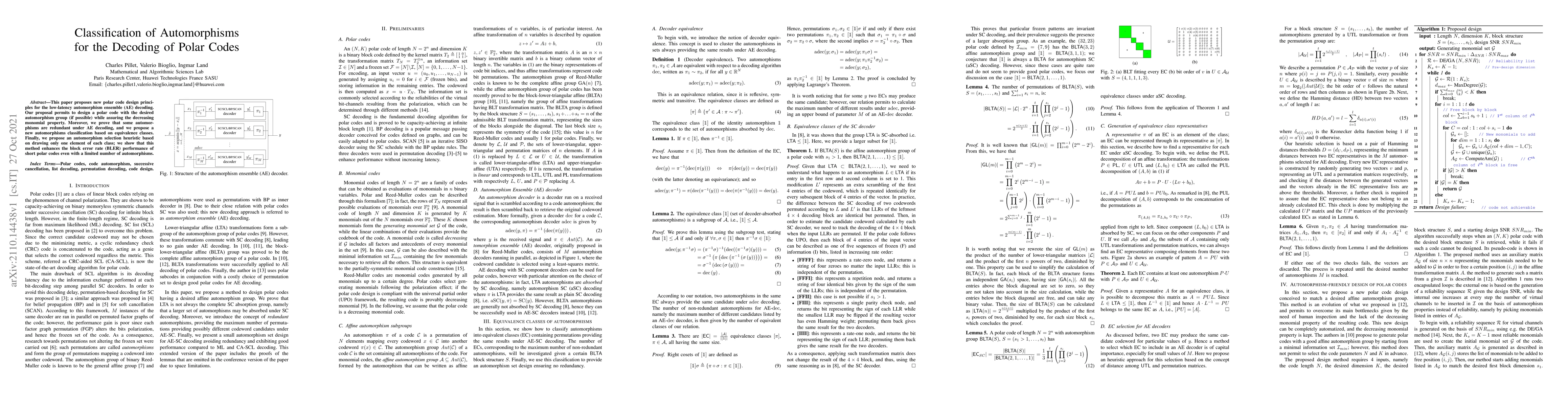 This paper proposes new polar code design principles for the low-latency automorphism ensemble (AE) decoding. Our proposal permits to design a polar code with the desired automorphism group (if possible) while assuring the decreasing monomial property. Moreover, we prove that some automorphisms are redundant under AE decoding, and we propose a new automorphisms classification based on equivalence classes. Finally, we propose an automorphism selection heuristic based on drawing only one element of each class; we show that this method enhances the block error rate (BLER) performance of short polar codes even with a limited number of automorphisms.