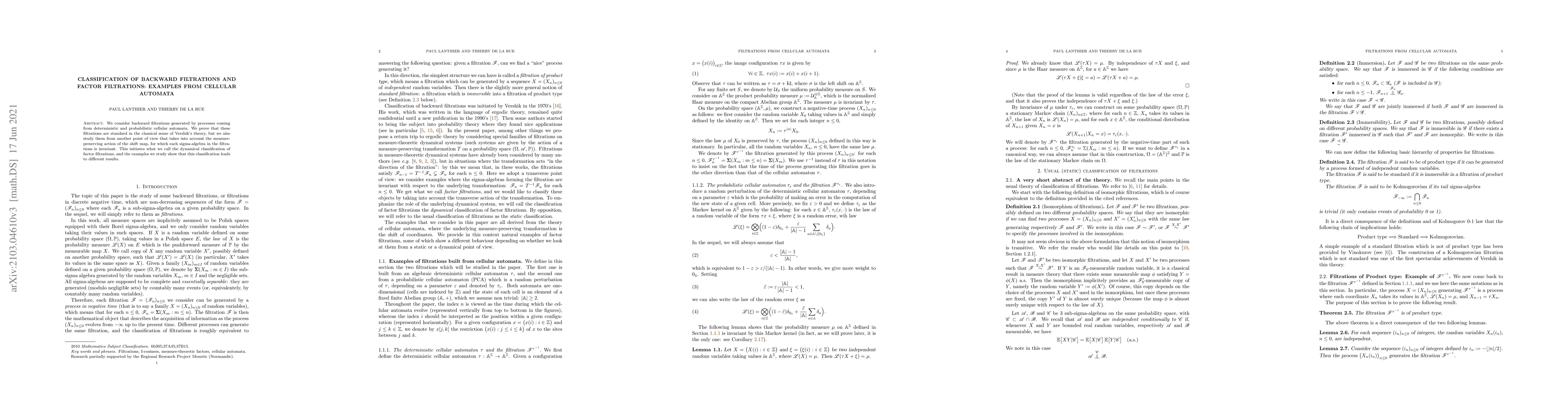 We consider backward filtrations generated by processes coming from deterministic and probabilistic cellular automata. We prove that these filtrations are standard in the classical sense of Vershik's theory, but we also study them from another point of view that takes into account the measurepreserving action of the shift map, for which each sigma-algebra in the filtrations is invariant. This initiates what we call the dynamical classification of factor filtrations, and the examples we study show that this classification leads to different results.