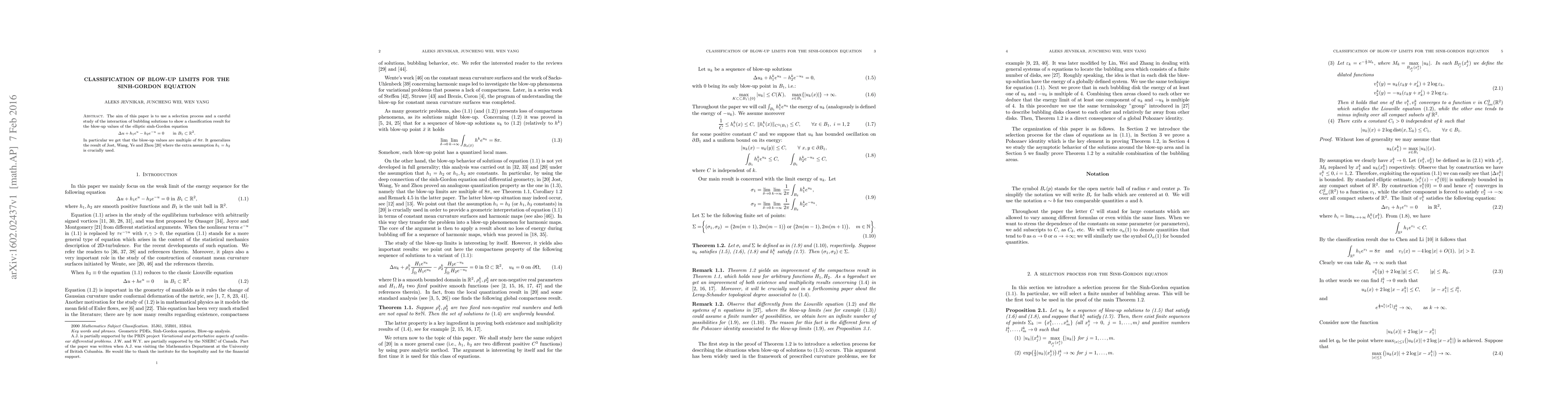 This paper classifies blow-up limits for the elliptic sinh-Gordon equation, demonstrating that the blow-up values are multiples of $8\pi$, without the assumption $h_1 = h_2$ previously required. This generalizes prior results by Jost, Wang, Ye, and Zhou.