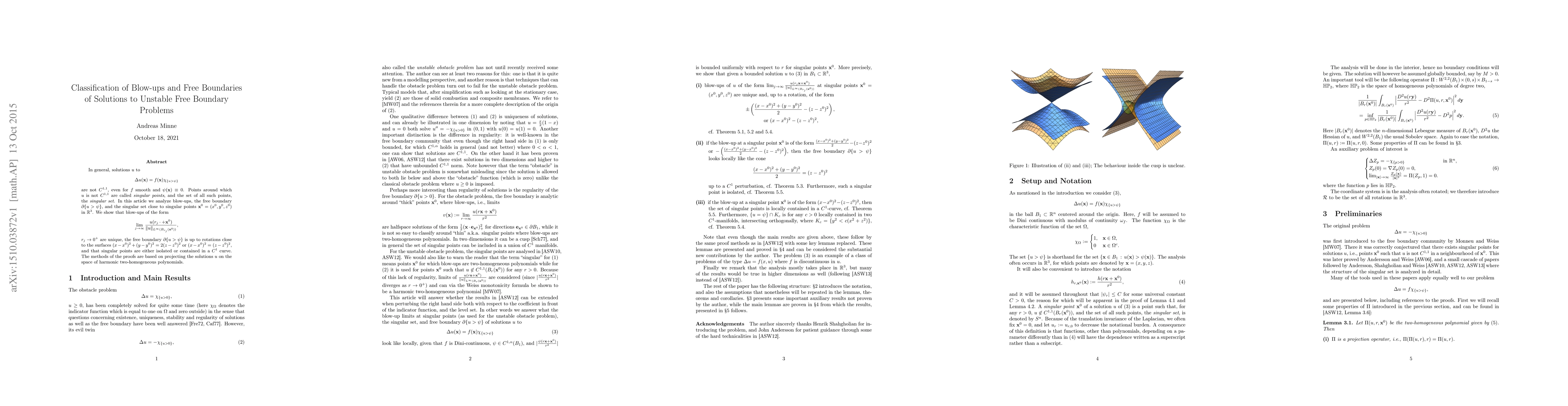 In general, solutions $u$ to \[ \Delta u(\mathbf{x})=f(\mathbf{x})\chi_{\{u>\psi\}} \] are not $C^{1,1}$, even for $f$ smooth and $\psi(\mathbf{x})\equiv0$. Points around which $u$ is not $C^{1,1}$ are called singular points, and the set of all such points, the singular set. In this article we analyze blow-ups, the free boundary $\partial\{u>\psi\}$, and the singular set close to singular points $\mathbf{x}^{0}=(x^{0},y^{0},z^{0})$ in $\mathbb{R}^{3}$. We show that blow-ups of the form \[ \lim_{j\to\infty}\frac{u(r_{j}\cdot+\mathbf{x}^{0})}{\|u\|_{L^{\infty}(B_{r_{j}}(\mathbf{x}^{0}))}}, \] $r_{j}\to0^{+}$ are unique, the free boundary $\partial\{u>\psi\}$ is up to rotations close to the surfaces $(x-x^{0})^{2}+(y-y^{0})^{2}=2(z-z^{0})^{2}$ or $(x-x^{0})^{2}=(z-z^{0})^{2}$, and that singular points are either isolated or contained in a $C^{1}$ curve. The methods of the proofs are based on projecting the solutions $u$ on the space of harmonic two-homogeneous polynomials.