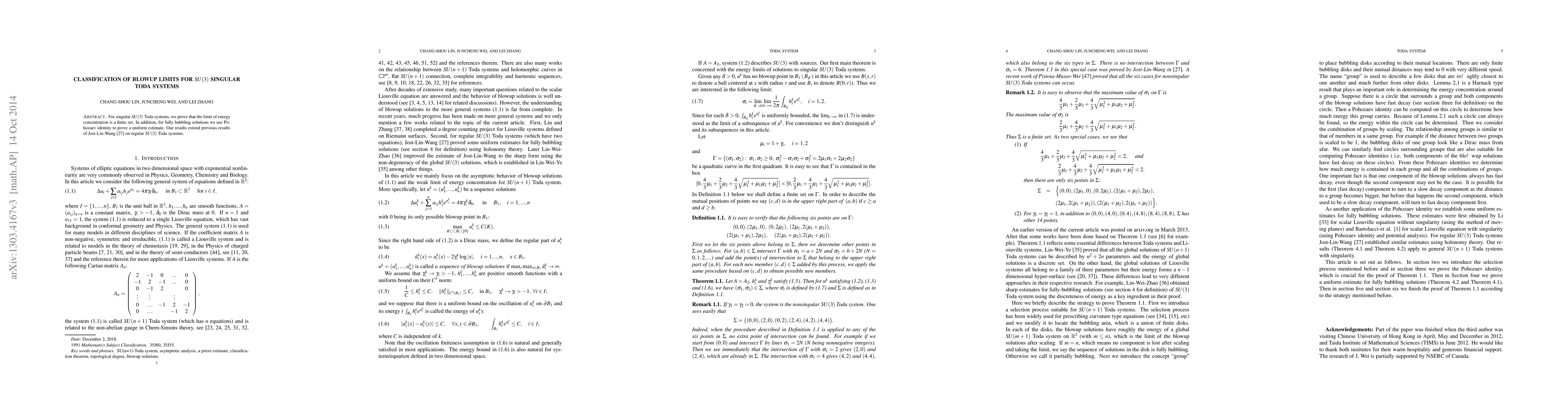 This paper proves that blowup limits for singular $SU(3)$ Toda systems concentrate energy into a finite set and provides a uniform estimate for fully bubbling solutions using the Pohozaev identity, extending prior work on regular $SU(3)$ Toda systems by Jost-Lin-Wang.