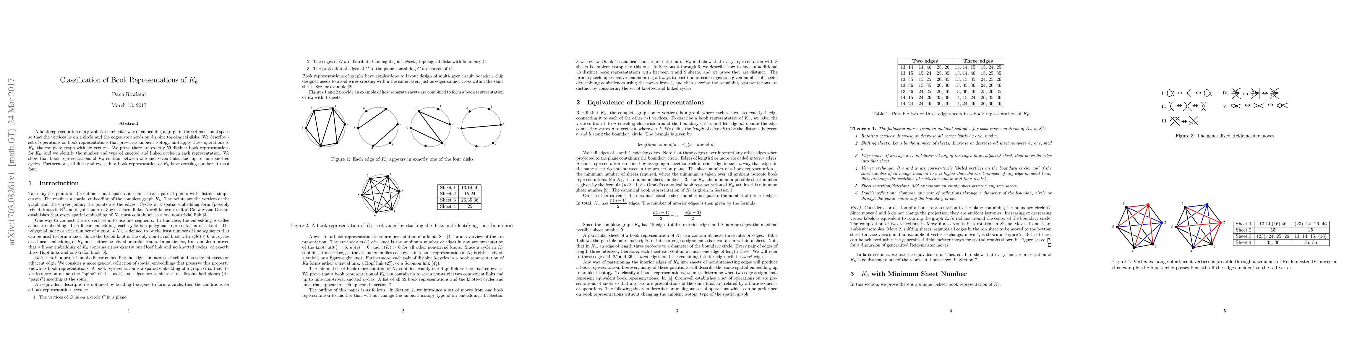 A book representation of a graph is a particular way of embedding a graph in three dimensional space so that the vertices lie on a circle and the edges are chords on disjoint topological disks. We describe a set of operations on book representations that preserves ambient isotopy, and apply these operations to $K_6$, the complete graph with six vertices. We prove there are exactly 59 distinct book representations for $K_6$, and we identify the number and type of knotted and linked cycles in each representation. We show that book representations of $K_6$ contain between one and seven links, and up to nine knotted cycles. Furthermore, all links and cycles in a book representation of $K_6$ have crossing number at most four.