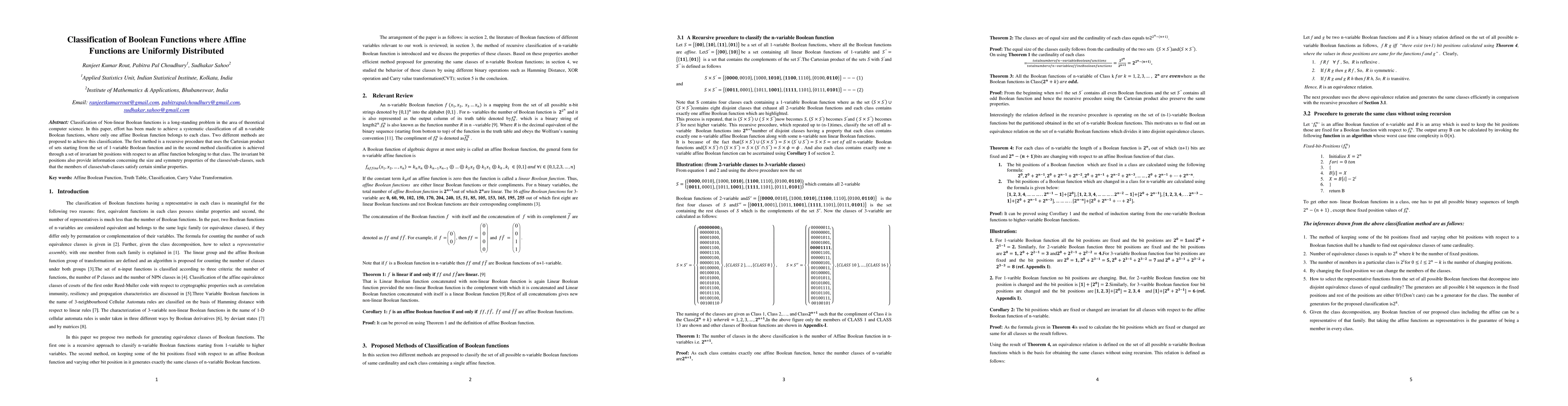This paper systematically classifies n-variable Boolean functions where each class contains exactly one affine Boolean function. Two methods are proposed: a recursive Cartesian product approach and a method based on invariant bit positions, which also reveals size and symmetry properties of the classes.