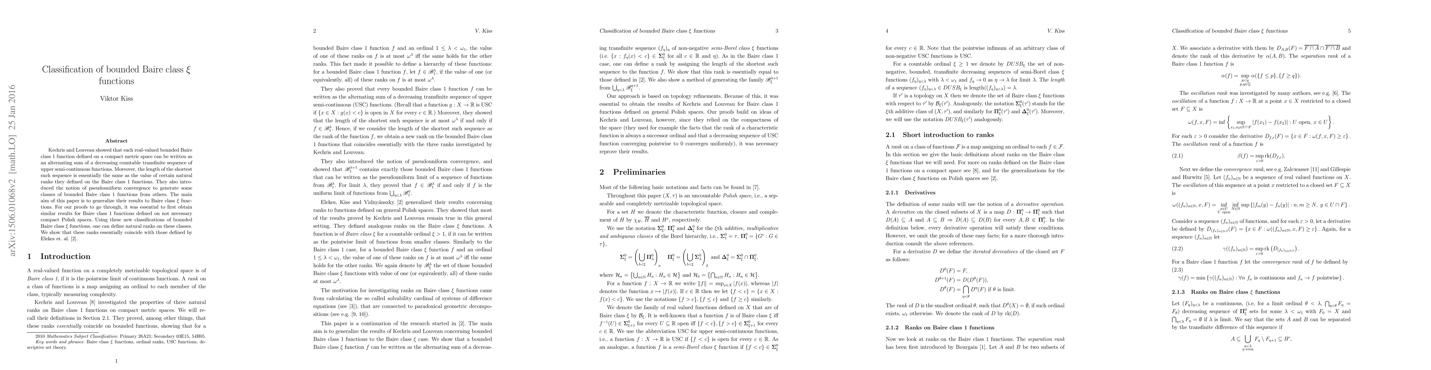 Kechris and Louveau showed that each real-valued bounded Baire class 1 function defined on a compact metric space can be written as an alternating sum of a decreasing countable transfinite sequence of upper semi-continuous functions. Moreover, the length of the shortest such sequence is essentially the same as the value of certain natural ranks they defined on the Baire class 1 functions. They also introduced the notion of pseudouniform convergence to generate some classes of bounded Baire class 1 functions from others. The main aim of this paper is to generalize their results to Baire class $\xi$ functions. For our proofs to go through, it was essential to first obtain similar results for Baire class 1 functions defined on not necessary compact Polish spaces. Using these new classifications of bounded Baire class $\xi$ functions, one can define natural ranks on these classes. We show that these ranks essentially coincide with those defined by Elekes et. al.