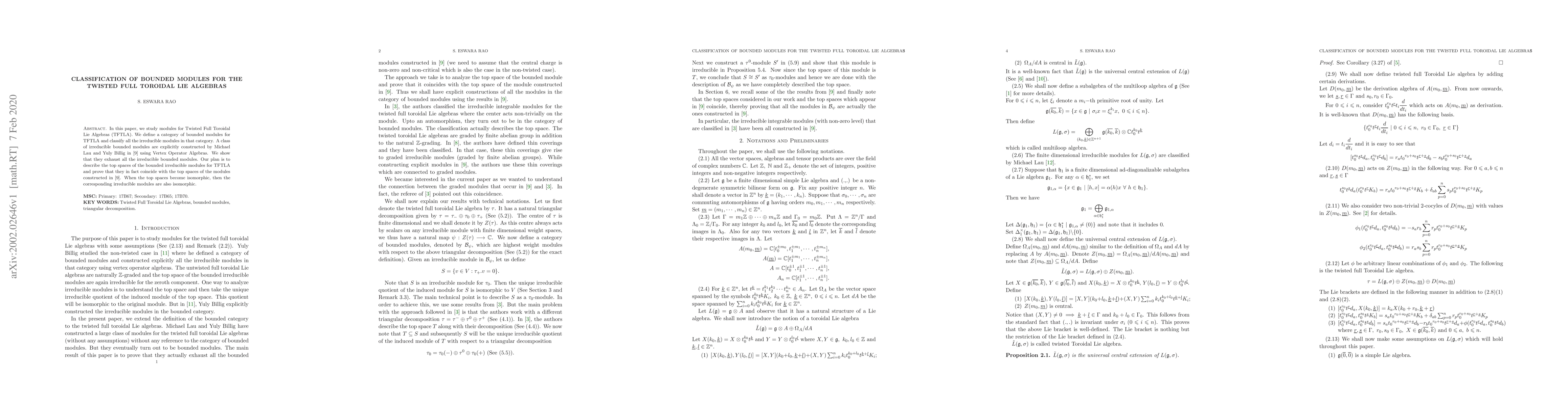 In this paper, we study modules for the Twisted Full Toroidal Lie Algebras (TFTLA). We define a category of bounded modules for TFTLA and classify all the irreducible modules in that category. A class of irreducible bounded modules are explicitly constructed by Michael Lau and Yuly Billig using Vertex operator algebras. We show that they exhaust all the irreducible bounded modules. Our plan is to describe the top spaces of the bounded irreducible modules for TFTLA and prove they in fact coincide with the top spaces of the modules constructed by Lau and Billig. When the top spaces become isomorphic then the corresponding irreducible modules are also isomorphic.