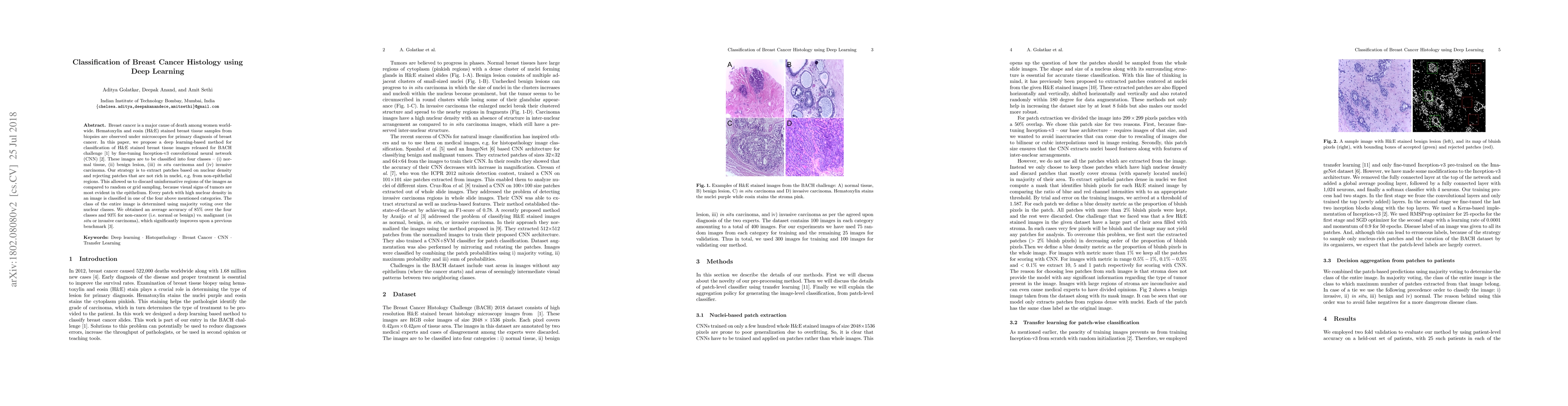This paper proposes a deep learning method using fine-tuned Inception-v3 CNN to classify H&E stained breast tissue images into four categories: normal, benign tumor, in-situ carcinoma, and invasive carcinoma. The method extracts nuclei-dense patches for training, improving accuracy to 85% for four-class and 93% for two-class classification.