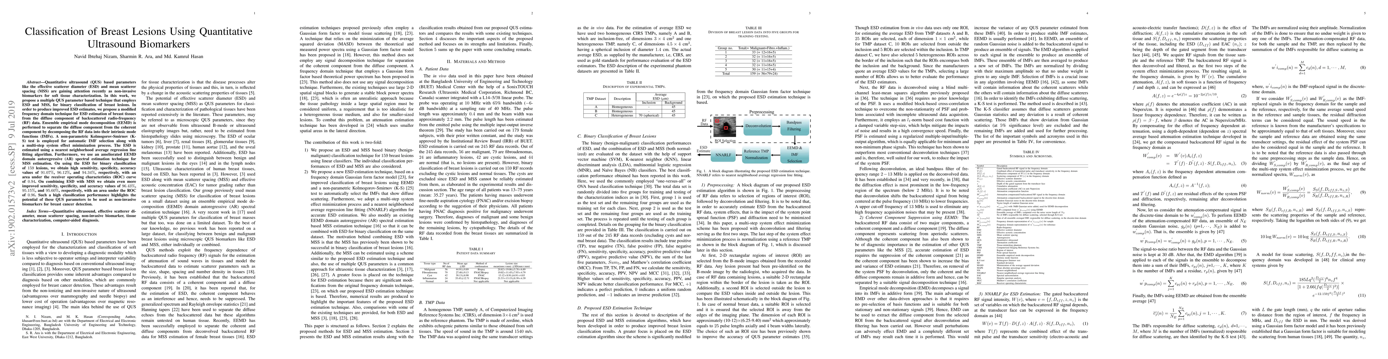 Quantitative ultrasound (QUS) based parameters like the effective scatterer diameter (ESD) and mean scatterer spacing (MSS) are gaining attention recently as non-invasive biomarkers for soft tissue characterization. In this work, we propose a multiple QUS parameter based technique that employs ESD and MSS, for binary classification of breast lesions. In order to produce improved ESD estimates, we propose a modified frequency domain technique for ESD estimation of breast tissues from the diffuse component of backscattered radio-frequency (RF) data. Ensemble empirical mode decomposition (EEMD) is performed to separate the diffuse component from the coherent component by decomposing the RF data into their intrinsic mode functions (IMFs). A non-parametric Kolmogorov-Smirnov (K-S) test is employed for automatic IMF selection along with a multi-step system effect minimization process. The ESD is estimated using a nearest neighborhood average regression line fitting algorithm. Furthermore, we use an ameliorated EEMD domain autoregressive (AR) spectral estimation technique for MSS estimation. On using the ESD for binary classification of 159 lesions, we obtain high sensitivity, specificity, accuracy values of 91.07%, 96.12%, and 94.34%, respectively, with an area under the receiver operating characteristics (ROC) curve of 0.94. On combining ESD with MSS we obtain even more improved sensitivity, specificity, and accuracy values of 96.43%, 95.15%, and 95.60%, respectively, with an area under the ROC of 0.96. Such a high classification performance highlights the potential of these QUS parameters to be used as non-invasive biomarkers for breast cancer detection.
