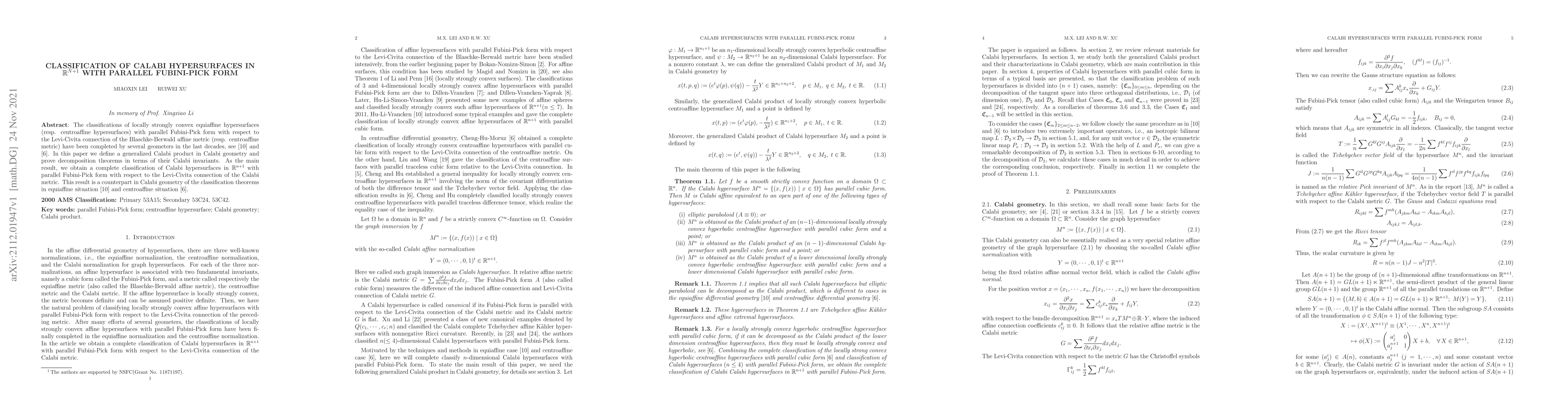 This paper classifies Calabi hypersurfaces in $\bbr^{n+1}$ with parallel Fubini-Pick form concerning the Levi-Civita connection of the Calabi metric. It establishes decomposition theorems using Calabi invariants and generalizes the classification results from equiaffine and centroaffine geometries.