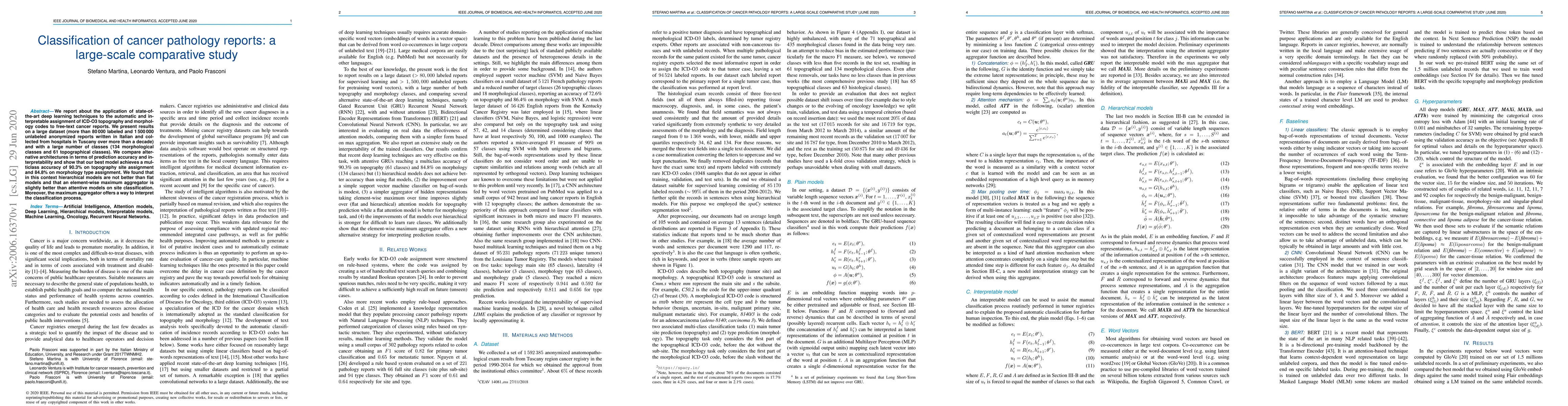 We report about the application of state-of-the-art deep learning techniques to the automatic and interpretable assignment of ICD-O3 topography and morphology codes to free-text cancer reports. We present results on a large dataset (more than 80 000 labeled and 1 500 000 unlabeled anonymized reports written in Italian and collected from hospitals in Tuscany over more than a decade) and with a large number of classes (134 morphological classes and 61 topographical classes). We compare alternative architectures in terms of prediction accuracy and interpretability and show that our best model achieves a multiclass accuracy of 90.3% on topography site assignment and 84.8% on morphology type assignment. We found that in this context hierarchical models are not better than flat models and that an element-wise maximum aggregator is slightly better than attentive models on site classification. Moreover, the maximum aggregator offers a way to interpret the classification process.