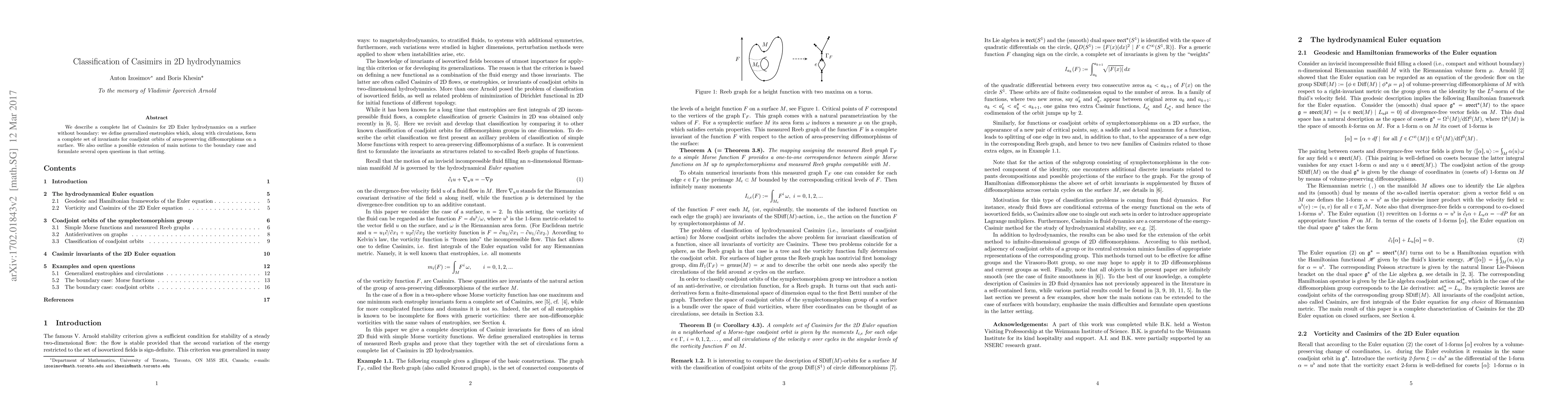 Researchers have classified Casimirs in 2D Euler hydrodynamics, defining a complete set of invariants for area-preserving diffeomorphisms on a surface. They also outline possible extensions to the boundary case and pose open questions.