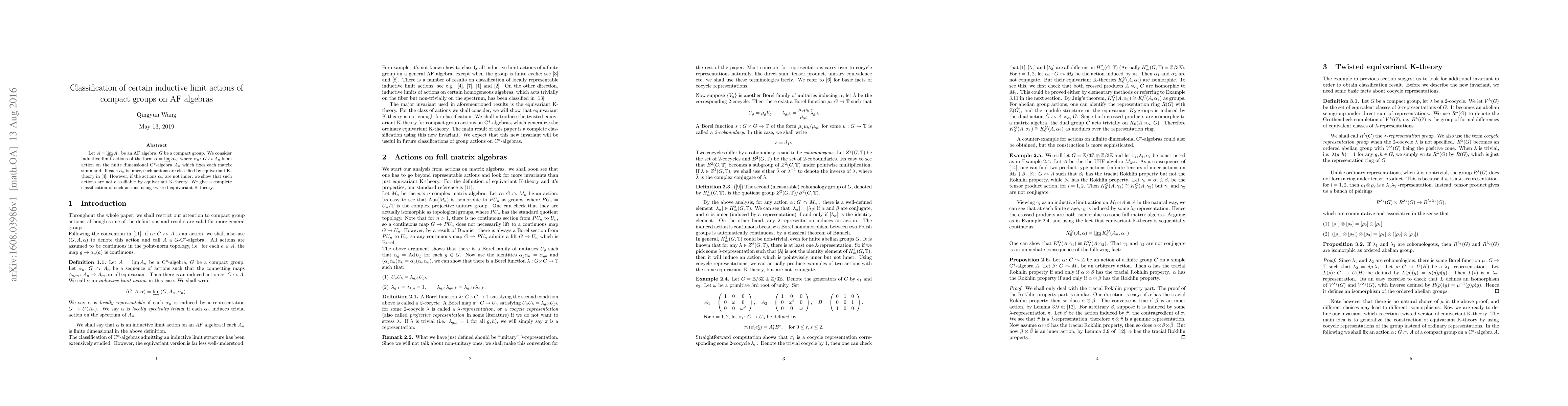 The paper classifies inductive limit actions of compact groups on AF algebras using twisted equivariant K-theory, providing a classification for non-inner actions that were previously unclassifiable.