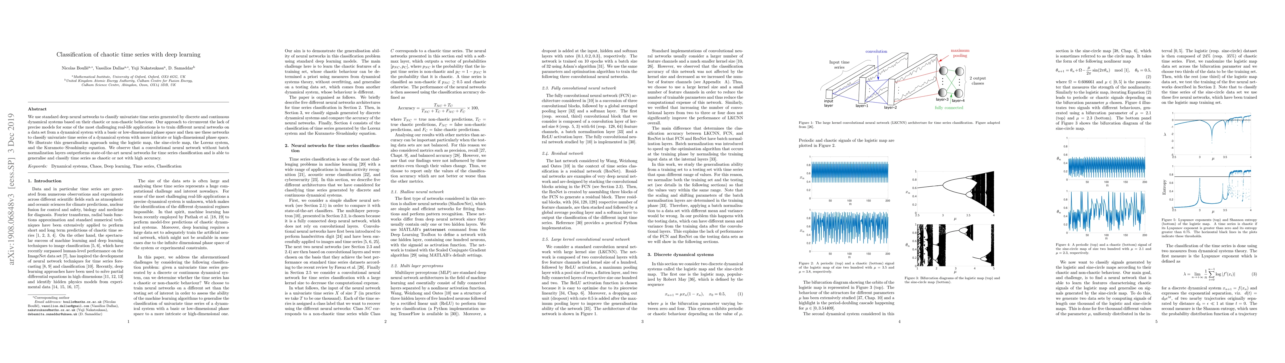 We use standard deep neural networks to classify univariate time series generated by discrete and continuous dynamical systems based on their chaotic or non-chaotic behaviour. Our approach to circumvent the lack of precise models for some of the most challenging real-life applications is to train different neural networks on a data set from a dynamical system with a basic or low-dimensional phase space and then use these networks to classify univariate time series of a dynamical system with more intricate or high-dimensional phase space. We illustrate this generalisation approach using the logistic map, the sine-circle map, the Lorenz system, and the Kuramoto--Sivashinsky equation. We observe that a convolutional neural network without batch normalization layers outperforms state-of-the-art neural networks for time series classification and is able to generalise and classify time series as chaotic or not with high accuracy.