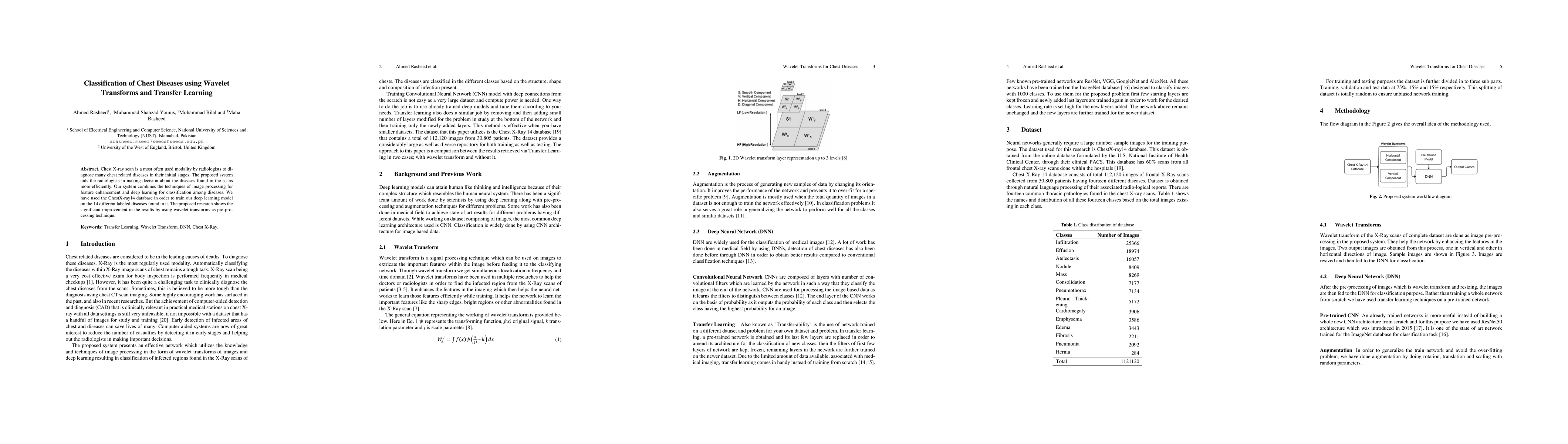 This paper proposes a system combining wavelet transforms for image enhancement and transfer learning for classifying chest diseases from X-ray scans. The study demonstrates significant improvement in classification accuracy using wavelet transforms pre-processing on the ChestX-ray14 dataset.