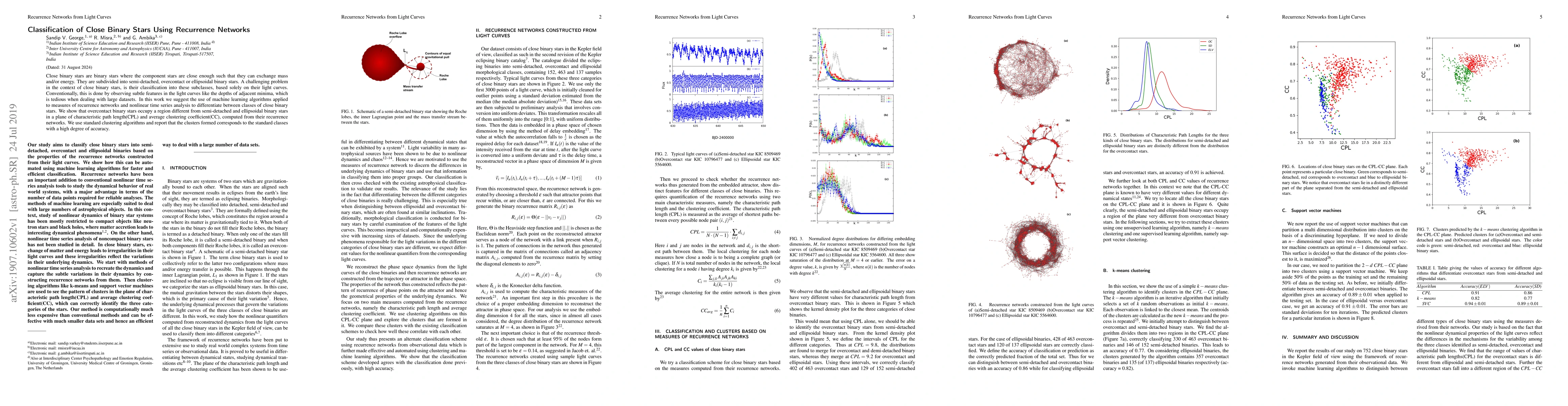 Close binary stars are binary stars where the component stars are close enough such that they can exchange mass and/or energy. They are subdivided into semi-detached, overcontact or ellipsoidal binary stars. A challenging problem in the context of close binary stars, is their classification into these subclasses, based solely on their light curves. Conventionally, this is done by observing subtle features in the light curves like the depths of adjacent minima, which is tedious when dealing with large datasets. In this work we suggest the use of machine learning algorithms applied to measures of recurrence networks and nonlinear time series analysis to differentiate between classes of close binary stars. We show that overcontact binary stars occupy a region different from semi-detached and ellipsoidal binary stars in a plane of characteristic path length(CPL) and average clustering coefficient(CC), computed from their recurrence networks. We use standard clustering algorithms and report that the clusters formed corresponds to the standard classes with a high degree of accuracy.