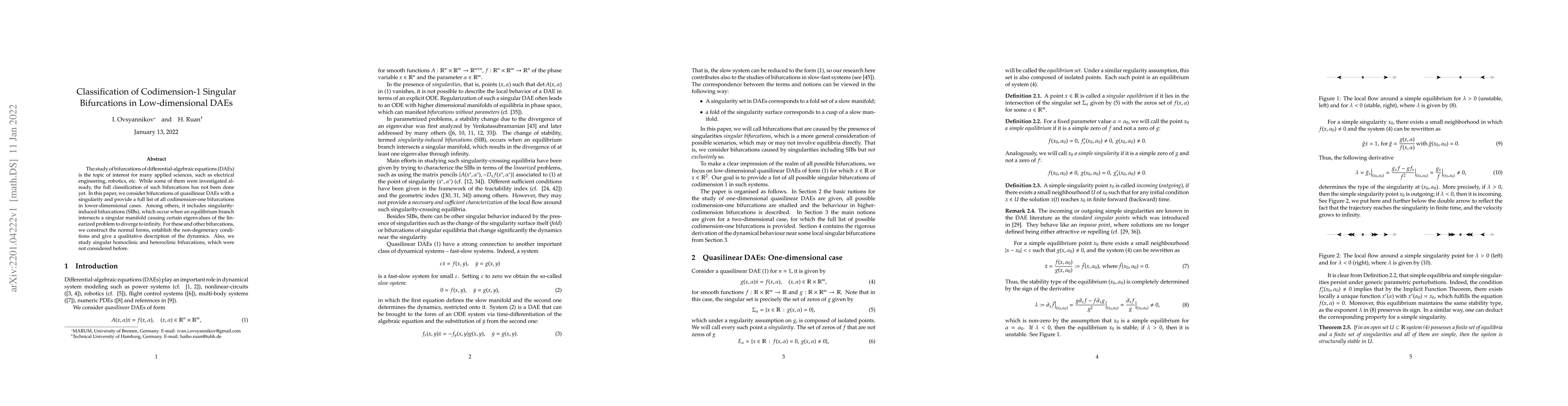 The study of bifurcations of differential-algebraic equations (DAEs) is the topic of interest for many applied sciences, such as electrical engineering, robotics, etc. While some of them were investigated already, the full classification of such bifurcations has not been done yet. In this paper, we consider bifurcations of quasilinear DAEs with a singularity and provide a full list of all codimension-one bifurcations in lower-dimensional cases. Among others, it includes singularity-induced bifurcations (SIBs), which occur when an equilibrium branch intersects a singular manifold causing certain eigenvalues of the linearized problem to diverge to infinity. For these and other bifurcations, we construct the normal forms, establish the non-degeneracy conditions and give a qualitative description of the dynamics. Also, we study singular homoclinic and heteroclinic bifurcations, which were not considered before.