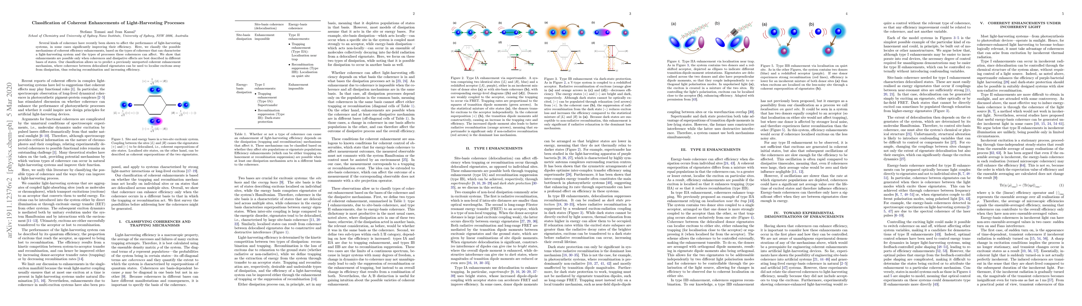 This paper classifies mechanisms for coherent enhancements in light-harvesting systems, identifying that efficiency improvements occur when coherences and dissipative effects are described in different state bases. It predicts a novel mechanism where coherence between delocalised eigenstates can localise excitons away from dissipation, thereby reducing recombination and boosting efficiency.