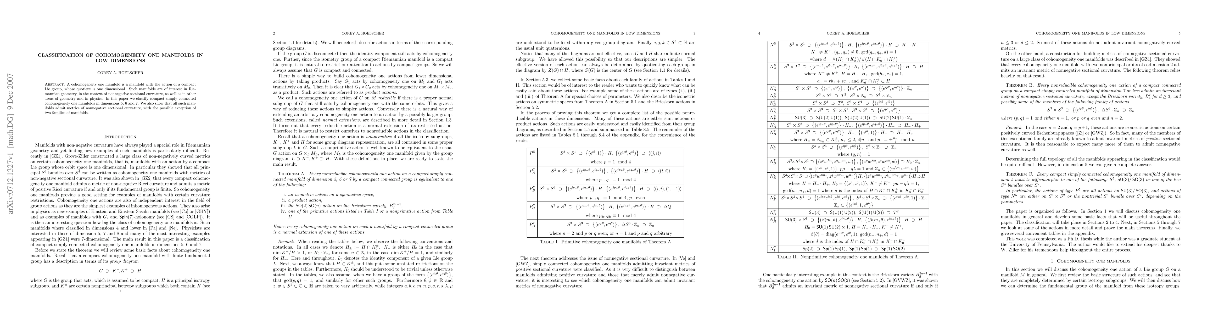 This paper classifies compact simply connected cohomogeneity one manifolds in dimensions 5, 6, and 7, demonstrating that most admit metrics of nonnegative sectional curvature, with a few exceptions.