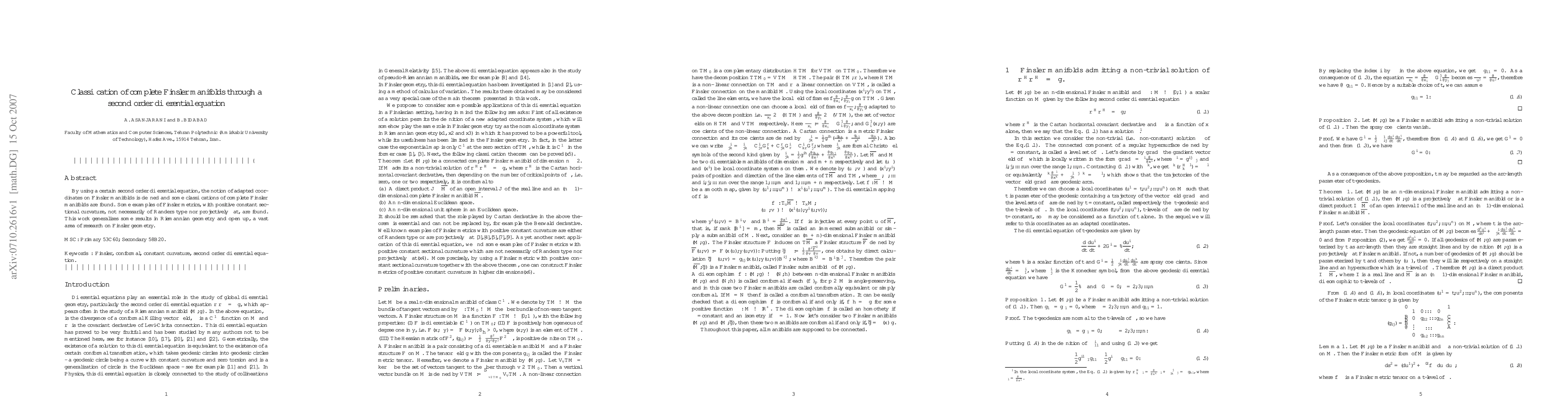 By using a certain second order differential equation, the notion of adapted coordinates on Finsler manifolds is defined and some classifications of complete Finsler manifolds are found. Some examples of Finsler metrics, with positive constant sectional curvature, not necessarily of Randers type nor projectively flat, are found. This work generalizes some results in Riemannian geometry and open up, a vast area of research on Finsler geometry.