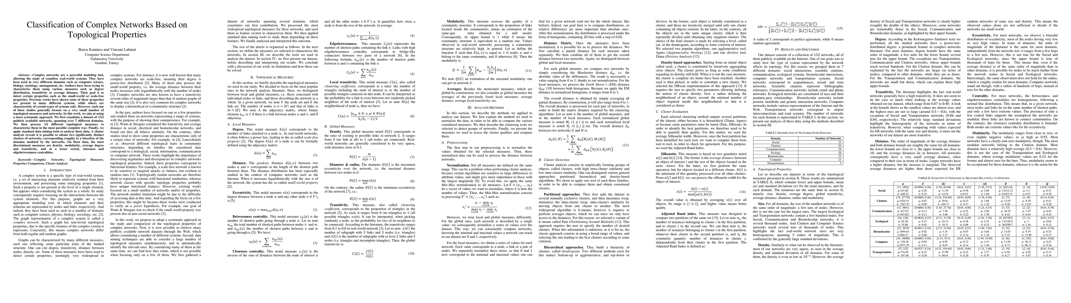 Complex networks are a powerful modeling tool, allowing the study of countless real-world systems. They have been used in very different domains such as computer science, biology, sociology, management, etc. Authors have been trying to characterize them using various measures such as degree distribution, transitivity or average distance. Their goal is to detect certain properties such as the small-world or scale-free properties. Previous works have shown some of these properties are present in many different systems, while others are characteristic of certain types of systems only. However, each one of these studies generally focuses on a very small number of topological measures and networks. In this work, we aim at using a more systematic approach. We first constitute a dataset of 152 publicly available networks, spanning over 7 different domains. We then process 14 different topological measures to characterize them in the most possible complete way. Finally, we apply standard data mining tools to analyze these data. A cluster analysis reveals it is possible to obtain two significantly distinct clusters of networks, corresponding roughly to a bisection of the domains modeled by the networks. On these data, the most discriminant measures are density, modularity, average degree and transitivity, and at a lesser extent, closeness and edgebetweenness centralities.Abstract--Complex networks are a powerful modeling tool, allowing the study of countless real-world systems. They have been used in very different domains such as computer science, biology, sociology, management, etc. Authors have been trying to characterize them using various measures such as degree distribution, transitivity or average distance. Their goal is to detect certain properties such as the small-world or scale-free properties. Previous works have shown some of these properties are present in many different systems, while others are characteristic of certain types of systems only. However, each one of these studies generally focuses on a very small number of topological measures and networks. In this work, we aim at using a more systematic approach. We first constitute a dataset of 152 publicly available networks, spanning over 7 different domains. We then process 14 different topological measures to characterize them in the most possible complete way. Finally, we apply standard data mining tools to analyze these data. A cluster analysis reveals it is possible to obtain two significantly distinct clusters of networks, corresponding roughly to a bisection of the domains modeled by the networks. On these data, the most discriminant measures are density, modularity, average degree and transitivity, and at a lesser extent, closeness and edgebetweenness centralities.