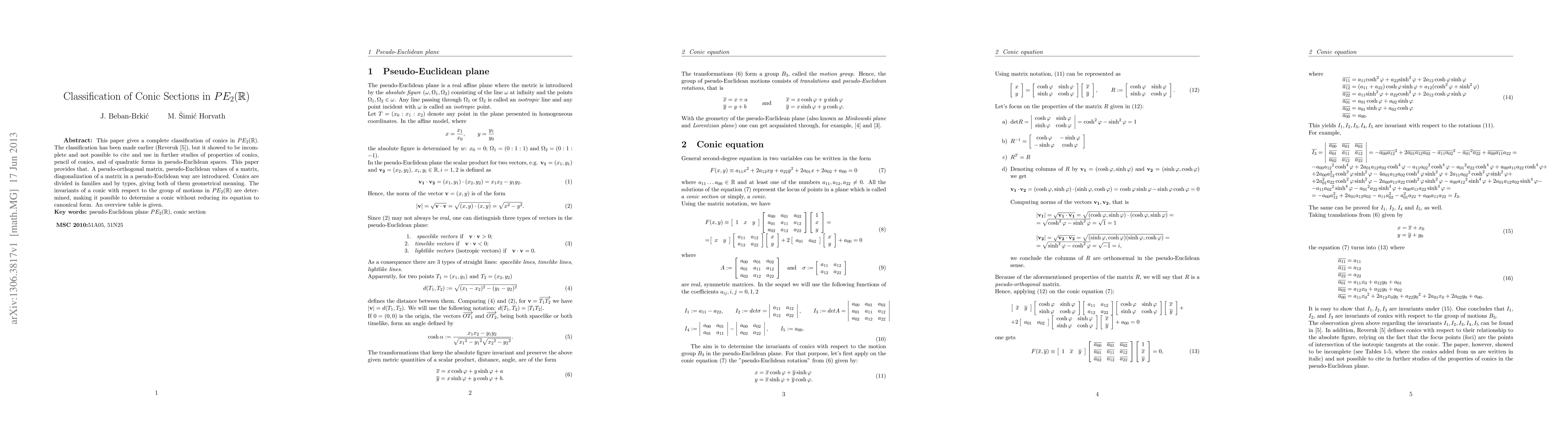 This paper gives a complete classification of conics in $PE_2(\mathbb{R})$. The classification has been made earlier (Reveruk [5]), but it showed to be incomplete and not possible to cite and use in further studies of properties of conics, pencil of conics, and of quadratic forms in pseudo-Euclidean spaces. This paper provides that. A pseudo-orthogonal matrix, pseudo-Euclidean values of a matrix, diagonalization of a matrix in a pseudo-Euclidean way are introduced. Conics are divided in families and by types, giving both of them geometrical meaning. The invariants of a conic with respect to the group of motions in $PE_2(\mathbb{R})$ are determined, making it possible to determine a conic without reducing its equation to canonical form. An overview table is given.