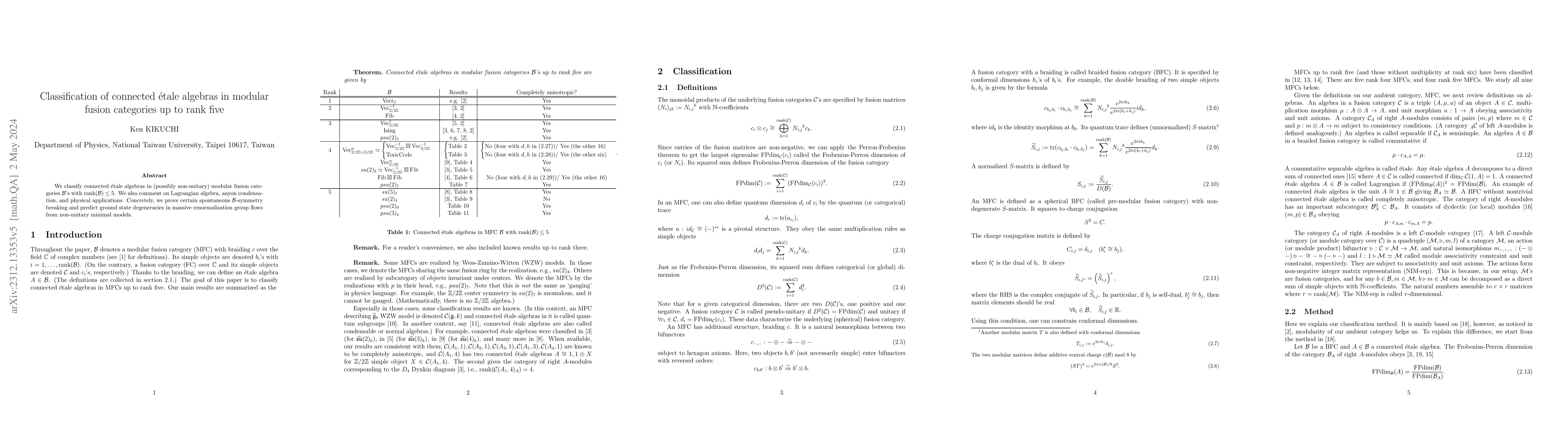This paper classifies connected \'etale algebras in modular fusion categories with rank up to five, exploring spontaneous symmetry breaking and ground state degeneracies in physical applications, including Lagrangian algebra and anyon condensation.