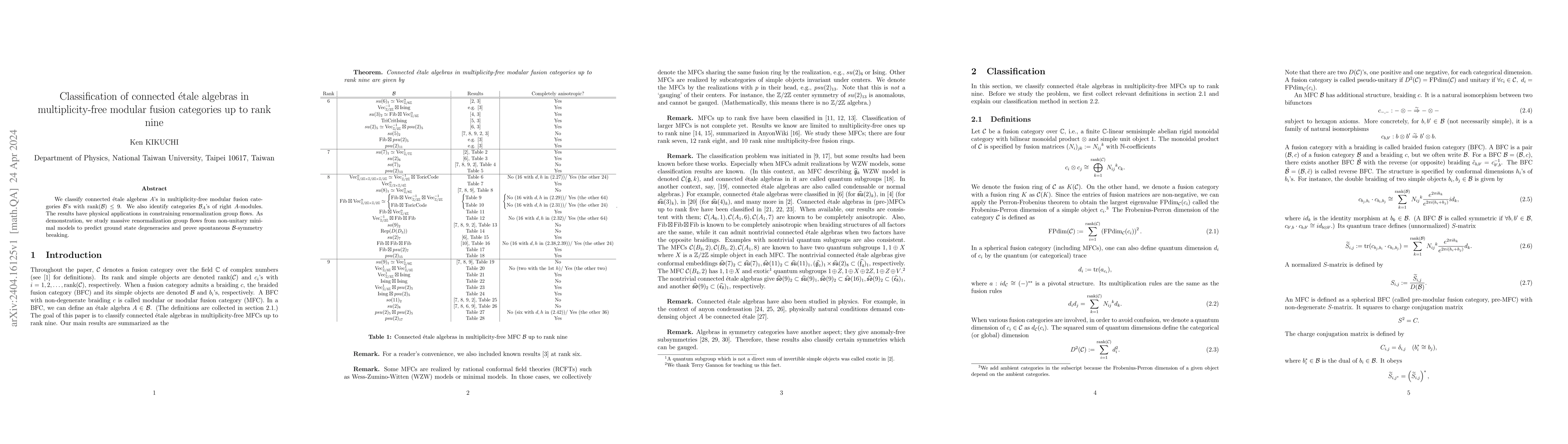 We classify connected \'etale algebras $A$'s in multiplicity-free modular fusion categories $\mathcal B$'s with $\text{rank}(\mathcal B)\le9$. We also identify categories $\mathcal B_A$'s of right $A$-modules. The results have physical applications in constraining renormalization group flows. As demonstration, we study massive renormalization group flows from non-unitary minimal models to predict ground state degeneracies and prove spontaneous $\mathcal B$-symmetry breaking.