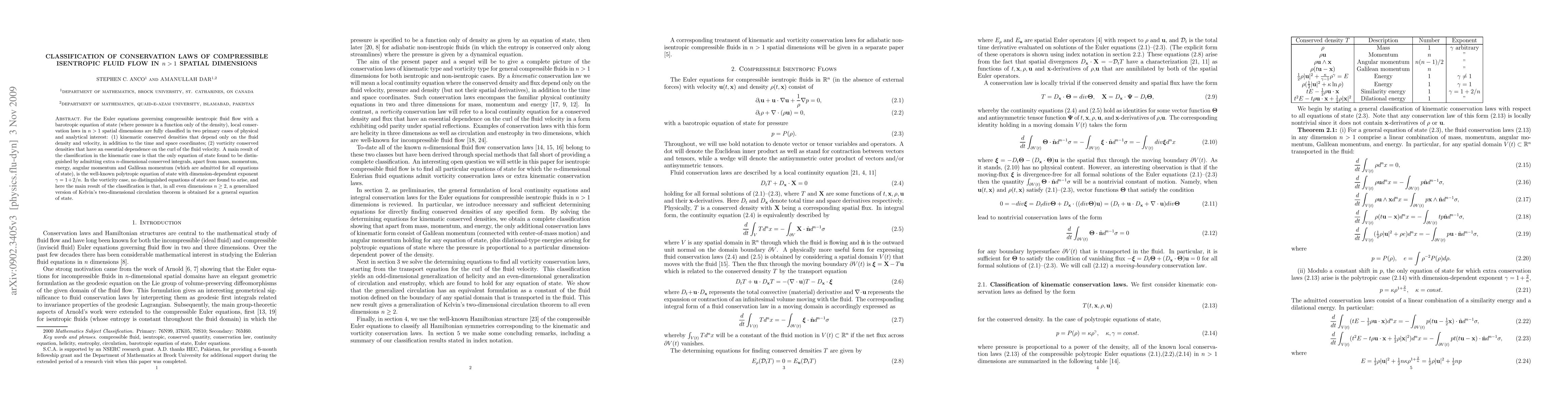 This paper classifies conservation laws for compressible isentropic fluid flow in $n>1$ dimensions, identifying two main types: kinematic densities dependent on density and velocity, and vorticity densities dependent on the fluid velocity's curl. The polytropic equation of state uniquely admits extra conserved integrals in the kinematic case, while a generalized Kelvin circulation theorem is found in the vorticity case for even dimensions.