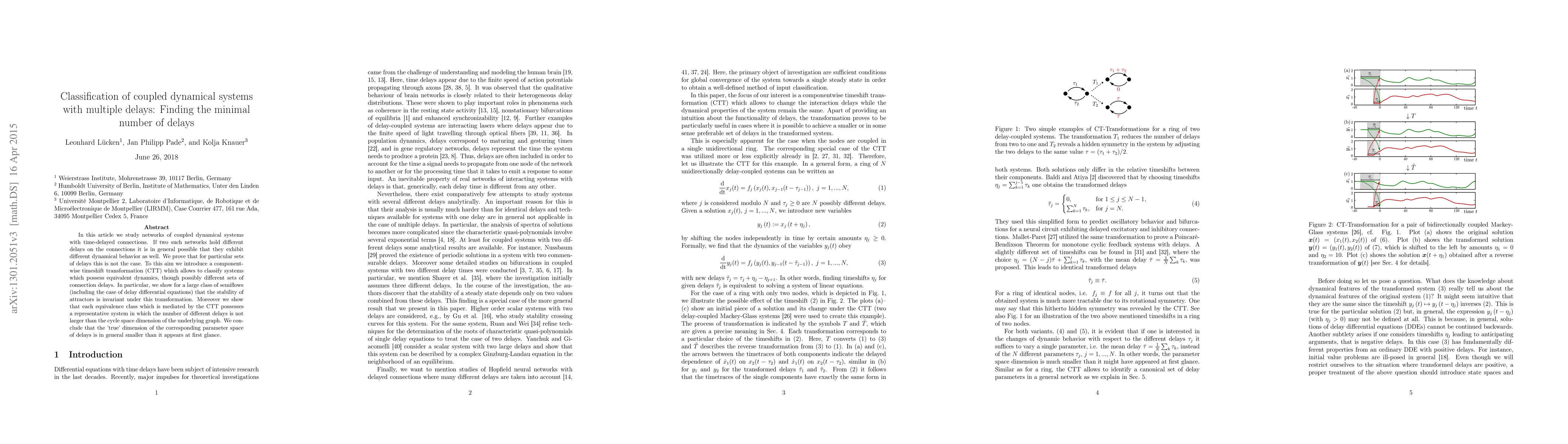 In this article we study networks of coupled dynamical systems with time-delayed connections. If two such networks hold different delays on the connections it is in general possible that they exhibit different dynamical behavior as well. We prove that for particular sets of delays this is not the case. To this aim we introduce a componentwise timeshift transformation (CTT) which allows to classify systems which possess equivalent dynamics, though possibly different sets of connection delays. In particular, we show for a large class of semiflows (including the case of delay differential equations) that the stability of attractors is invariant under this transformation. Moreover we show that each equivalence class which is mediated by the CTT possesses a representative system in which the number of different delays is not larger than the cycle space dimension of the underlying graph. We conclude that the 'true' dimension of the corresponding parameter space of delays is in general smaller than it appears at first glance.