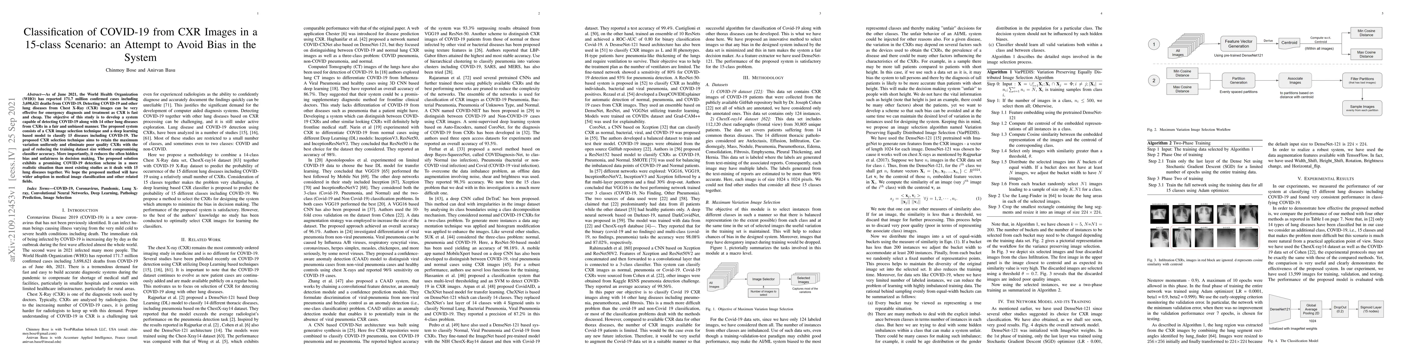 As of June 2021, the World Health Organization (WHO) has reported 171.7 million confirmed cases including 3,698,621 deaths from COVID-19. Detecting COVID-19 and other lung diseases from Chest X-Ray (CXR) images can be very effective for emergency diagnosis and treatment as CXR is fast and cheap. The objective of this study is to develop a system capable of detecting COVID-19 along with 14 other lung diseases from CXRs in a fair and unbiased manner. The proposed system consists of a CXR image selection technique and a deep learning based model to classify 15 diseases including COVID-19. The proposed CXR selection technique aims to retain the maximum variation uniformly and eliminate poor quality CXRs with the goal of reducing the training dataset size without compromising classifier accuracy. More importantly, it reduces the often hidden bias and unfairness in decision making. The proposed solution exhibits a promising COVID-19 detection scheme in a more realistic situation than most existing studies as it deals with 15 lung diseases together. We hope the proposed method will have wider adoption in medical image classification and other related fields.