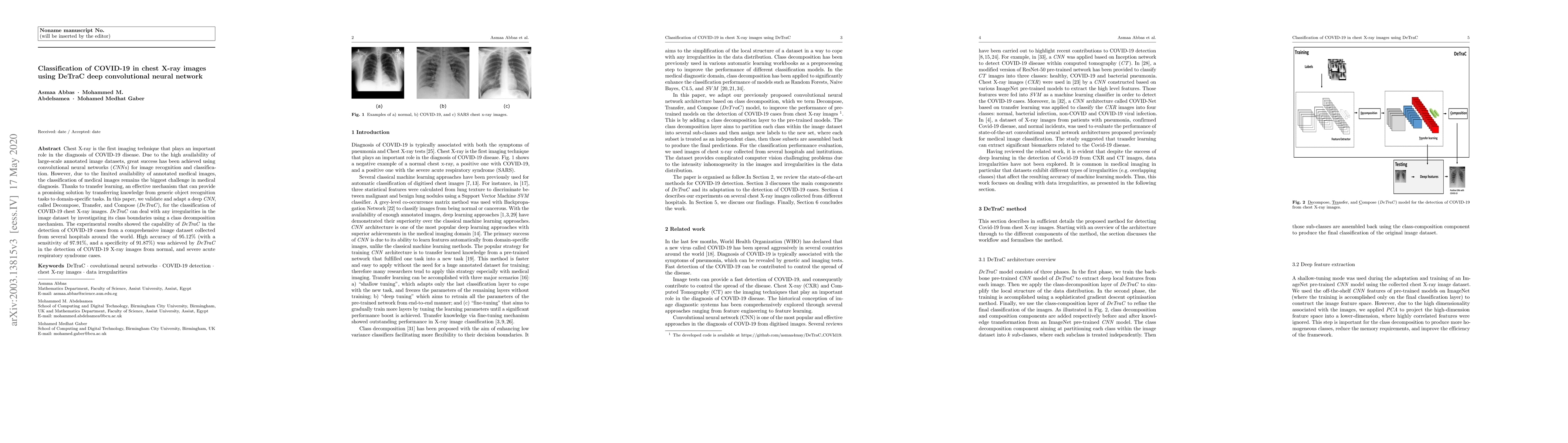 This paper adapts the DeTraC deep convolutional neural network for classifying COVID-19 in chest X-ray images, achieving 95.12% accuracy through transfer learning and class decomposition mechanisms. The model demonstrates high sensitivity and specificity in distinguishing COVID-19 cases from normal and other respiratory syndromes.