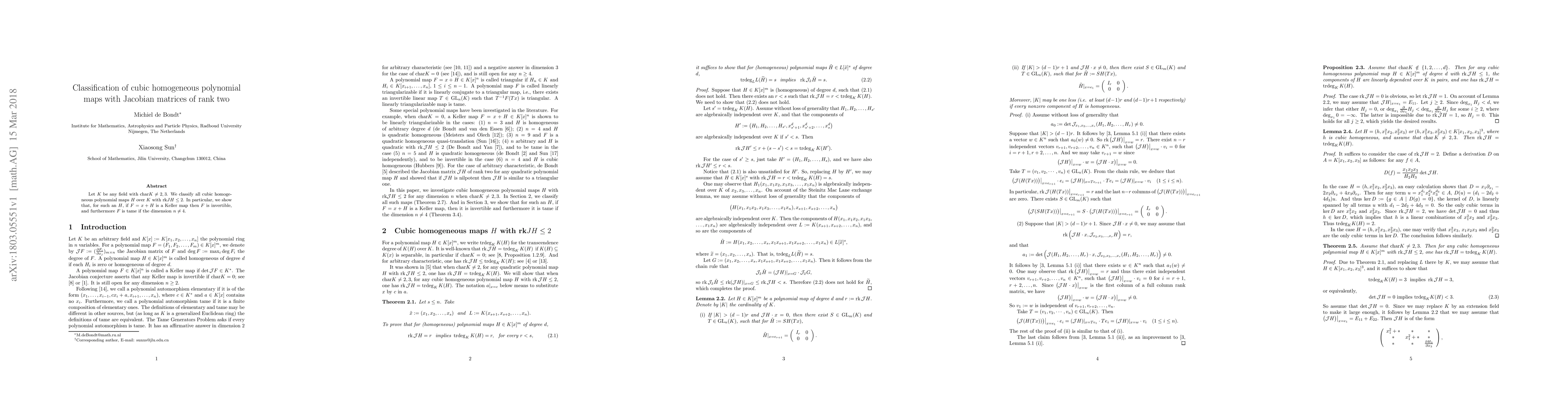 Let $K$ be any field with $\textup{char}K\neq 2,3$. We classify all cubic homogeneous polynomial maps $H$ over $K$ with $\textup{rk} JH\leq 2$. In particular, we show that, for such an $H$, if $F=x+H$ is a Keller map then $F$ is invertible, and furthermore $F$ is tame if the dimension $n\neq 4$.