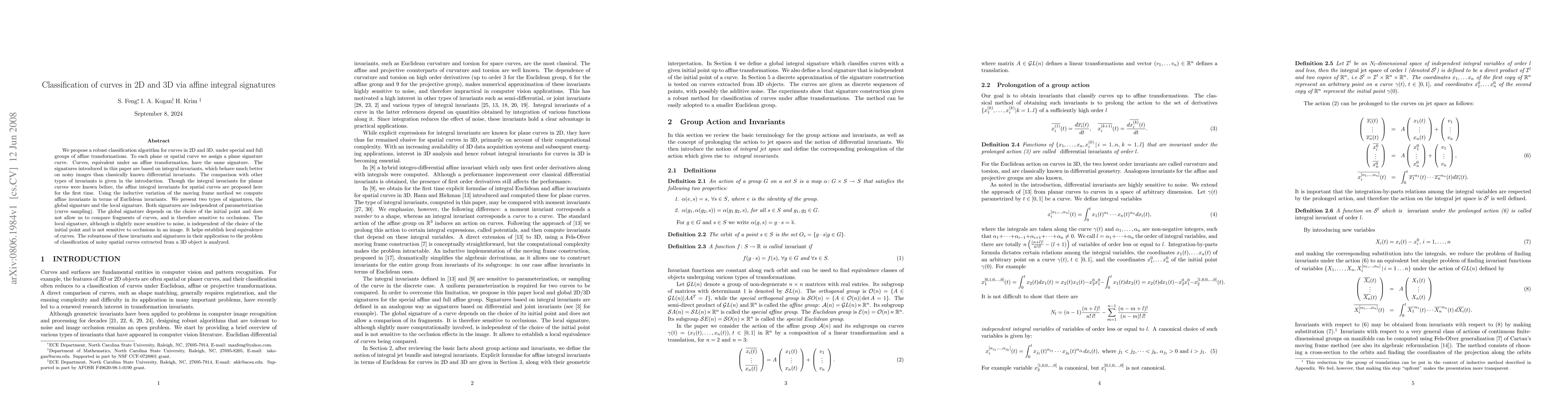 We propose a robust classification algorithm for curves in 2D and 3D, under the special and full groups of affine transformations. To each plane or spatial curve we assign a plane signature curve. Curves, equivalent under an affine transformation, have the same signature. The signatures introduced in this paper are based on integral invariants, which behave much better on noisy images than classically known differential invariants. The comparison with other types of invariants is given in the introduction. Though the integral invariants for planar curves were known before, the affine integral invariants for spatial curves are proposed here for the first time. Using the inductive variation of the moving frame method we compute affine invariants in terms of Euclidean invariants. We present two types of signatures, the global signature and the local signature. Both signatures are independent of parameterization (curve sampling). The global signature depends on the choice of the initial point and does not allow us to compare fragments of curves, and is therefore sensitive to occlusions. The local signature, although is slightly more sensitive to noise, is independent of the choice of the initial point and is not sensitive to occlusions in an image. It helps establish local equivalence of curves. The robustness of these invariants and signatures in their application to the problem of classification of noisy spatial curves extracted from a 3D object is analyzed.