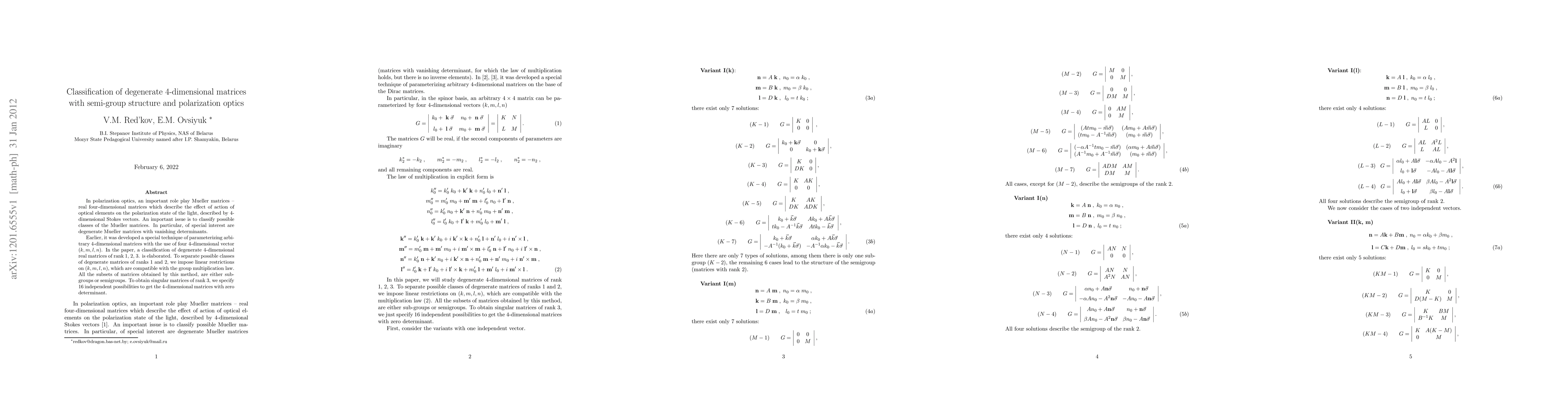 In polarization optics, an important role play Mueller matrices -- real four-dimensional matrices which describe the effect of action of optical elements on the polarization state of the light, described by 4-dimensional Stokes vectors. An important issue is to classify possible classes of the Mueller matrices. In particular, of special interest are degenerate Mueller matrices with vanishing determinants. Earlier, it was developed a special technique of parameterizing arbitrary 4-dimensional matrices with the use of four 4-dimensional vector (k, m, l, n). In the paper, a classification of degenerate 4-dimensional real matrices of rank 1, 2, 3. is elaborated. To separate possible classes of degenerate matrices of ranks 1 and 2, we impose linear restrictions on (k, m, l, n), which are compatible with the group multiplication law. All the subsets of matrices obtained by this method, are either sub-groups or semigroups. To obtain singular matrices of rank 3, we specify 16 independent possibilities to get 4-dimensional matrices with zero determinant.