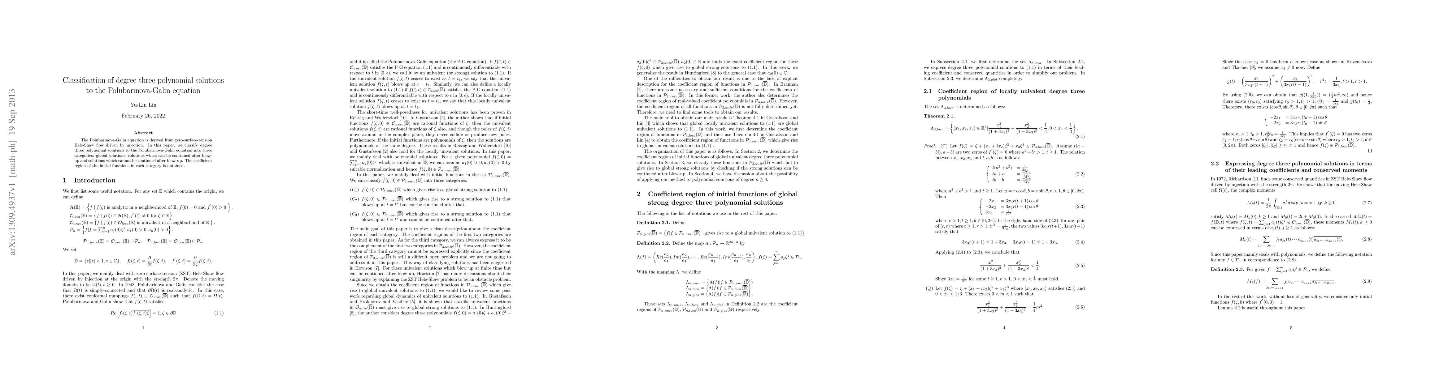 The Polubarinova-Galin equation is derived from zero-surface-tension Hele-Shaw flow driven by injection. In this paper, we classify degree three polynomial solutions to the Polubarinova-Galin equation into three categories: global solutions, solutions which can be continued after blow-up and solutions which cannot be continued after blow-up. The coefficient region of the initial functions in each category is obtained.