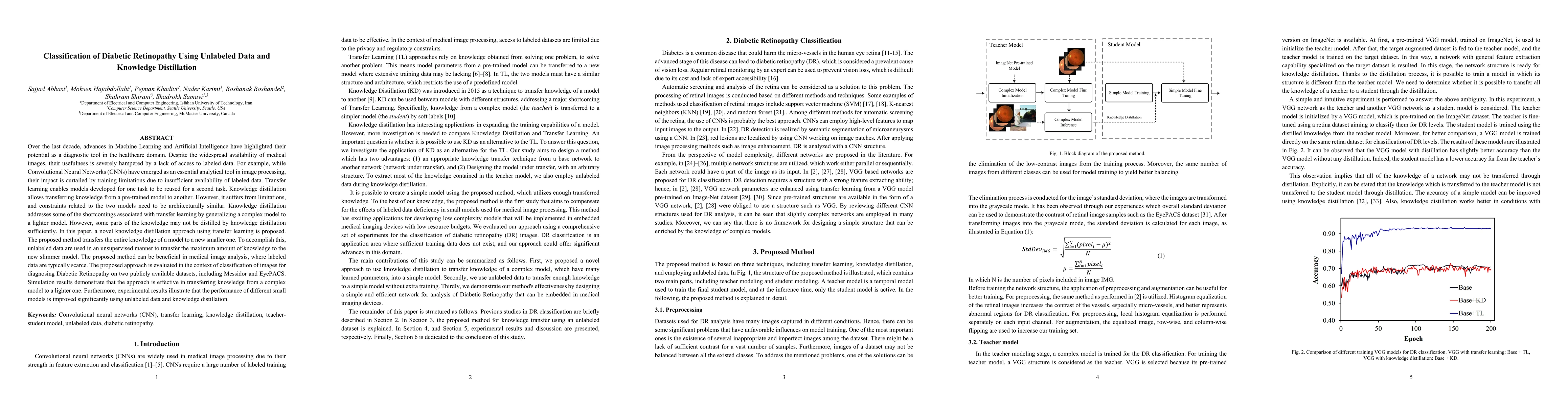 Knowledge distillation allows transferring knowledge from a pre-trained model to another. However, it suffers from limitations, and constraints related to the two models need to be architecturally similar. Knowledge distillation addresses some of the shortcomings associated with transfer learning by generalizing a complex model to a lighter model. However, some parts of the knowledge may not be distilled by knowledge distillation sufficiently. In this paper, a novel knowledge distillation approach using transfer learning is proposed. The proposed method transfers the entire knowledge of a model to a new smaller one. To accomplish this, unlabeled data are used in an unsupervised manner to transfer the maximum amount of knowledge to the new slimmer model. The proposed method can be beneficial in medical image analysis, where labeled data are typically scarce. The proposed approach is evaluated in the context of classification of images for diagnosing Diabetic Retinopathy on two publicly available datasets, including Messidor and EyePACS. Simulation results demonstrate that the approach is effective in transferring knowledge from a complex model to a lighter one. Furthermore, experimental results illustrate that the performance of different small models is improved significantly using unlabeled data and knowledge distillation.